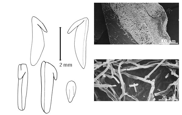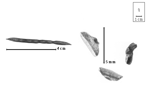 Seed: 4.6 mm long; 2 mm wide; 0.6 mm thick; overgrown, 1 seed filling entire fruit cavity; not angular; asymmetrical; reniform; flattened; with surface smooth; without visible radicle and cotyledon lobes; without hilar sinus; without umbo on seed faces; without medial ridge on each face. Cuticle not exfoliating; not inflated; not wrinkled. Testa present; without pieces of adhering epicarp; not adhering to endocarp; free from endocarp; glossy; not modified by a bloom; colored; monochrome; dark brown; glabrous; not smooth; with recessed features; finely grooved; chartaceous. Pleurogram absent. Pseudopleurogram absent. Fracture lines absent. Rim absent. Wing(s) absent. Raphe not visible. Hilum present; visible; with faboid split; with the lips of the faboid split lighter colored than the rest of the hilum and therefore conspicuous; punctiform; apical according to radicle tip but marginal according to seed length; recessed; within rim; rim color lighter than testa. Lens discernible; 0.7 mm long; with margins straight; oblong; not in groove of raphe; adjacent to hilum; 0.7 mm from hilum; flush; same color as testa; dark brown; not within corona, halo, or rim. Endosperm absent. Cotyledons smooth; both outer faces convex; both the same thickness; both more or less of equal length; not folded; margin entire 180 degrees from base of radicle; similar at apex; not concealing radicle; entire over radicle; without lobes; with the interface division terminating at base of radicle; without margins recessed; dark brown; inner face flat; glabrous on inner face. Embryonic axis straight; oblique to length of seed; without a joint evident between the radicle and the cotyledons. Radicle differentiated from cotyledon; linear; lobe tip straight; oblique to cotyledons; centered between cotyledons; less than 1/2 length of cotyledons. Plumule rudimentary; glabrous.