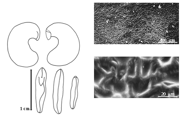 Seed: 9–15 mm long; 5–7 mm wide; 0.5–0.6 mm thick; not overgrown; not angular; asymmetrical; C-shaped; flattened; with surface smooth; without visible radicle and cotyledon lobes; with umbo on seed faces; without medial ridge on each face. Cuticle not exfoliating; not inflated; not wrinkled. Testa present; without pieces of adhering epicarp; not adhering to endocarp; free from endocarp; glossy; not modified by a bloom; colored; monochrome; brown (reddish); glabrous; not smooth; with elevated features; wrinkled; chartaceous. Pleurogram absent. Pseudopleurogram absent. Fracture lines absent. Rim absent. Wing(s) absent. Raphe not visible. Hilum present; fully concealed; concealed by funicular remnant; without faboid split; larger than punctiform; 0.8 mm long; with straight outline; linear; marginal according to radicle tip; flush; not within corona, halo, or rim. Lens not discernible. Endosperm present; thin; not pluglike and not resembling tip of radicle; covering entire embryo; adnate to testa. Cotyledons smooth; both outer faces convex; both the same thickness; both more or less of equal length; not folded; margin entire 180 degrees from base of radicle; similar at apex; not concealing radicle; entire over radicle; without lobes; with the interface division terminating at base of radicle; without margins recessed; tan (greenish); inner face flat; glabrous on inner face. Embryonic axis deflexed; oblique to length of seed; without a joint evident between the radicle and the cotyledons. Radicle differentiated from cotyledon; linear; deflexed and parallel to cotyledon length; centered between cotyledons; less than 1/2 length of cotyledons. Plumule rudimentary; glabrous.