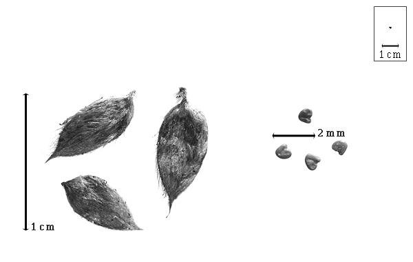 ; unilocular; 0.6–1 cm long; 0.3–0.45 cm wide; 0.1–0.15 cm thick; length less than twice as long as width, or 2–9 times longer than wide; with deciduous androecial sheath; with deciduous corolla; with persistent calyx; with calyx shorter than fruit; without orifice formed by curving of fruit or fruit segments; straight; not plicate; not twisted; symmetrical; oblong (ovate), or lanceolate (linear), or linear; not inflated; compressed to flattened; without beak; short tapered at apex; aligned with longitudinal axis of fruit; rounded at base; aligned with longitudinal axis of fruit; with the apex and base uniform in texture; membranous; seed chambers externally invisible; margin not constricted; margin without sulcus; margin plain; wing(s) absent; nonstipitate; with all layers dehiscing; splitting along suture(s). Dehiscence of valves along 1 suture (apparently); assumed apical and down; passive. Replum invisible. Epicarp dull; monochrome; brown; with surface texture uniform; pubescent and indurate; with hairs erect; with 1 type of pubescence; pilose, or tomentose; with pubescence golden; with simple hairs; pliable; with hair bases plain; without spines; apparently smooth; not veined; not tuberculate; not exfoliating; without cracks; without embedded tissue, much thicker than epicarp, running from base to apex. Mesocarp absent, or present; thin; surface not veined; 1-layered; without balsamic vesicles; without fibers; without reniform canals; solid; chartaceous. Endocarp present; visible; dull; opaque; monochrome; brown; smooth; without adhering pieces of testa; nonseptate; chartaceous; not exfoliating; remaining fused to mesocarp and epicarp; remaining fused to epicarp; without wings; entire. Seed(s) 4–8; length parallel with fruit length, or transverse to fruit length; neither overlapping nor touching; in 1 series. Funiculus 1.5–1.7 mm long; of 1 length only; filiform; straight. Aril absent.