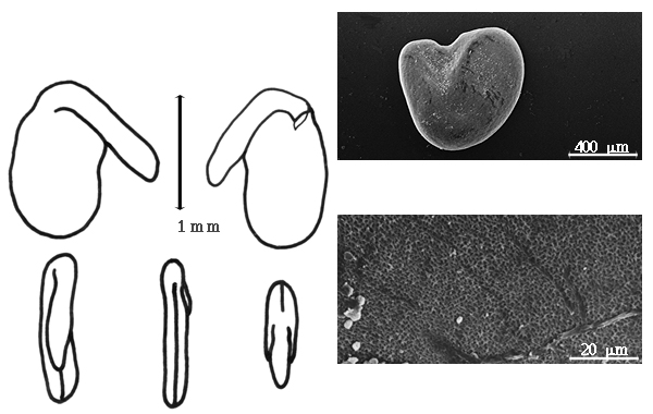 Seed: 1–1.2 mm long; 1–1.2 mm wide; 0.4–0.5 mm thick; not overgrown; not angular; asymmetrical; mitaform; compressed; with visible radicle and cotyledon lobes; without external groove between radicle and cotyledon lobes; without umbo on seed faces; without medial ridge on each face. Cuticle not exfoliating; not inflated; not wrinkled. Testa present; without pieces of adhering epicarp; not adhering to endocarp; free from endocarp; dull; not modified by a bloom; colored; monochrome; greenish brown; glabrous; smooth; coriaceous. Pleurogram absent. Pseudopleurogram absent. Fracture lines absent. Rim absent. Wing(s) absent. Raphe not visible. Hilum present; visible; with faboid split; with the lips of the faboid split the same color as the rest of the hilum; punctiform; between cotyledon and radicle lobe; recessed; within rim; rim color of testa. Lens discernible; with margins straight; wedge-shaped; not in groove of raphe; adjacent to hilum; mounded; same color as testa; not within corona, halo, or rim. Endosperm present; thin; not pluglike and not resembling tip of radicle; covering entire embryo; adnate to testa. Cotyledons smooth; both outer faces convex; both the same thickness; both more or less of equal length; not folded; margin entire 180 degrees from base of radicle; similar at apex; not concealing radicle; entire over radicle; without lobes; with the interface division terminating at base of radicle; without margins recessed; yellow; inner face flat; glabrous on inner face. Embryonic axis deflexed; oblique to length of seed; without a joint evident between the radicle and the cotyledons. Radicle differentiated from cotyledon; linear; deflexed and parallel to cotyledon length; centered between cotyledons; 1/2 to nearly length of cotyledons. Plumule moderately developed; glabrous.