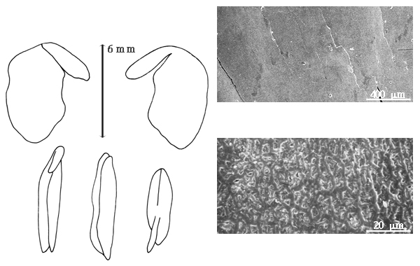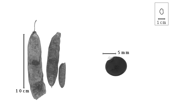 Seed: (7–)10–11 mm long; (4.5–)6–7 mm wide; 2–3 mm thick; not overgrown; not angular; symmetrical; reniform; compressed; with surface smooth; without visible radicle and cotyledon lobes; without hilar sinus; without umbo on seed faces; without medial ridge on each face. Cuticle not exfoliating; not inflated; not wrinkled. Testa present; without pieces of adhering epicarp; not adhering to endocarp; free from endocarp; glossy; not modified by a bloom; colored; monochrome; tan to brown; glabrous; smooth; chartaceous. Pleurogram absent. Pseudopleurogram absent. Fracture lines absent. Rim absent. Wing(s) absent. Raphe not visible. Hilum present; visible; with faboid split; with the lips of the faboid split lighter colored than the rest of the hilum and therefore conspicuous; larger than punctiform; 1.2–1.8 mm long; with curved outline; elliptic to circular; apical according to radicle tip but marginal according to seed length; recessed; within rim; rim color darker than testa. Lens discernible; 1.2 mm long; with margins curved; 2 oblong mounds separated by groove; not in groove of raphe; confluent with hilum; mounded; same color as testa; brown; not within corona, halo, or rim. Endosperm absent. Cotyledons smooth; both the same thickness; both more or less of equal length; not folded; margin entire 180 degrees from base of radicle; similar at apex; completely concealing radicle, or partially concealing radicle; entire over radicle, or notched at radicle; without lobes; with the interface division terminating at base of radicle; without margins recessed; tan; inner face flat; glabrous on inner face. Embryonic axis oblique; oblique to length of seed; without a joint evident between the radicle and the cotyledons. Radicle differentiated from cotyledon; bulbose; lobe tip straight; oblique to cotyledons; centered between cotyledons; less than 1/2 length of cotyledons. Plumule rudimentary; glabrous.