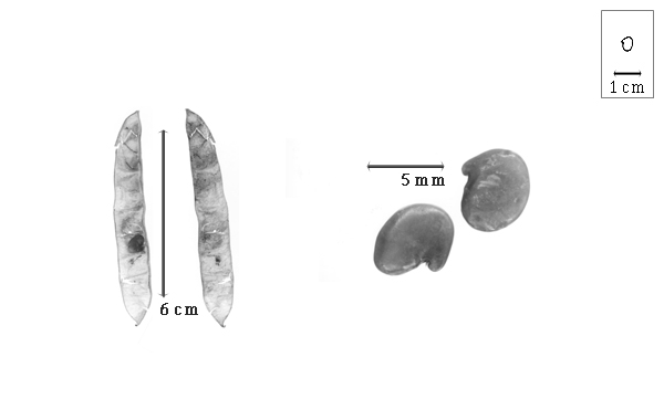 Seed: 6.3–7 mm long; 5–6.5 mm wide; 1.7–2.2 mm thick; not overgrown; not angular; asymmetrical; irregular; compressed; with surface smooth; with visible radicle and cotyledon lobes; without external groove between radicle and cotyledon lobes; without hilar sinus; without umbo on seed faces; without medial ridge on each face. Cuticle not exfoliating; not inflated; not wrinkled. Testa present; without pieces of adhering epicarp; not adhering to endocarp; free from endocarp; dull; not modified by a bloom; colored; monochrome; brown; glabrous; smooth; chartaceous. Pleurogram absent. Pseudopleurogram absent. Fracture lines absent. Rim absent. Wing(s) absent. Raphe not visible. Hilum present; partially concealed; concealed by radicle lobe; with faboid split; with the lips of the faboid split the same color as the rest of the hilum; larger than punctiform; ca. 0.5 mm long; with curved outline; circular; apical according to radicle tip but marginal according to seed length; recessed; not within corona, halo, or rim. Lens discernible; ca. 1.5 mm long; with margins straight; narrowly diamond-shaped; not in groove of raphe; adjacent to hilum; 0.3 mm from hilum; slightly mounded; similar color as testa; darker than testa; not within corona, halo, or rim. Endosperm present; trace; not pluglike and not resembling tip of radicle; restricted to region of embryo; adnate to testa. Cotyledons smooth; both outer faces convex; both the same thickness; both more or less of equal length; not folded; margin entire 180 degrees from base of radicle; similar at apex; partially concealing radicle; notched at radicle; without lobes; with the interface division terminating at base of radicle; without margins recessed; greenish tan to white (creamy); inner face flat; glabrous on inner face. Embryonic axis oblique; oblique to length of seed; without a joint evident between the radicle and the cotyledons. Radicle differentiated from cotyledon; bulbose; lobe tip straight, or curved; oblique to cotyledons; centered between cotyledons; less than 1/2 length of cotyledons, or 1/2 to nearly length of cotyledons. Plumule rudimentary; glabrous.