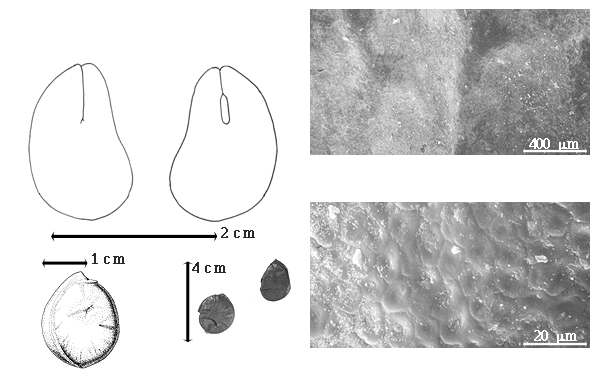Seed: 20–25 mm long; 14–20 mm wide; 5–6 mm thick; not overgrown; not angular; symmetrical; elliptic to circular; flattened; with surface smooth; without visible radicle and cotyledon lobes; without hilar sinus; without umbo on seed faces; without medial ridge on each face. Cuticle not exfoliating; not inflated; not wrinkled. Testa present; without pieces of adhering epicarp; not adhering to endocarp; free from endocarp; glossy; not modified by a bloom; colored; monochrome; dark reddish brown; glabrous; not smooth; with elevated features; rugose (when dry); chartaceous. Pleurogram absent. Pseudopleurogram absent. Fracture lines absent. Rim absent. Wing(s) absent. Raphe not visible. Hilum present; fully concealed; concealed by funicular remnant; without faboid split; larger than punctiform; 0.1–2.5 mm long; not stated; apical at apex of radicle tip; flush; not within corona, halo, or rim. Lens not discernible. Endosperm absent. Cotyledons smooth; both outer faces convex; both the same thickness; both more or less of equal length; not folded; margin entire 180 degrees from base of radicle; similar at apex; completely concealing radicle; long split over radicle; with the interface division terminating at base of radicle; without margins recessed; inner face flat; glabrous on inner face. Embryonic axis straight; parallel to length of seed; without a joint evident between the radicle and the cotyledons. Radicle differentiated from cotyledon; centered between cotyledons. Plumule rudimentary; glabrous.