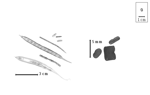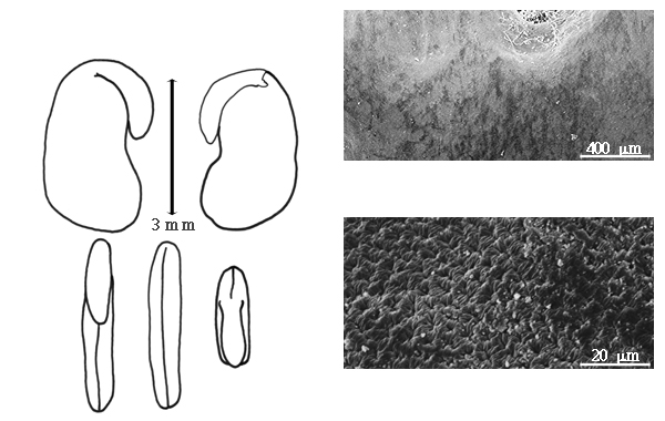 Seed: 3.5–4 mm long; 1.5–4 mm wide; 1–1.5 mm thick; not overgrown; angular, or not angular (some are square in outline); symmetrical; linear, or rectangular, or quadrangular; compressed, or flattened; without visible radicle and cotyledon lobes; without hilar sinus; without umbo on seed faces; without medial ridge on each face. Cuticle not exfoliating; not inflated; not wrinkled. Testa present; without pieces of adhering epicarp; not adhering to endocarp; free from endocarp; glossy, or dull; not modified by a bloom; colored; monochrome; light to dark reddish brown, or tan (reddish near hilum); glabrous; smooth; coriaceous. Pleurogram absent. Pseudopleurogram absent. Fracture lines absent. Rim absent. Wing(s) absent. Raphe not visible. Hilum present; fully concealed; concealed by funicular remnant; without faboid split; punctiform; marginal according to radicle tip; flush; not within corona, halo, or rim, or within halo; halo darker than testa. Lens discernible, or not discernible; with margins curved; circular; not in groove of raphe; adjacent to hilum; 0.3 mm from hilum; mounded; same color as testa; within halo; halo color darker than testa. Endosperm present; thick; not pluglike and not resembling tip of radicle; covering entire embryo; adnate to embryo. Cotyledons smooth; both outer faces convex; both the same thickness; both more or less of equal length; not folded; margin entire 180 degrees from base of radicle; similar at apex; not concealing radicle; entire over radicle; without lobes; with the interface division terminating at base of radicle; without margins recessed; yellow, or tan; inner face flat; glabrous on inner face. Embryonic axis deflexed; oblique to length of seed; without a joint evident between the radicle and the cotyledons. Radicle differentiated from cotyledon; bulbose, or linear; deflexed and parallel to cotyledon length; centered between cotyledons; less than 1/2 length of cotyledons, or 1/2 to nearly length of cotyledons. Plumule rudimentary; glabrous.