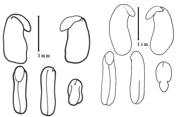 Seed: 3–7 mm long, or 10–12 mm long (in Sesbania sect. Glottidium); 1.5–5 mm wide, or 4.5–6.5 mm wide (in Sesbania sect. Glottidium); 1.5–5 mm thick; not overgrown; not angular; asymmetrical; oblong, or rectangular, or quadrangular, or mitaform, or reniform; terete, or compressed; with surface smooth; without visible radicle and cotyledon lobes, or with visible radicle and cotyledon lobes (in Sesbania sect. Glottidium); without external groove between radicle and cotyledon lobes; without hilar sinus; without umbo on seed faces; without medial ridge on each face. Cuticle not exfoliating; not inflated; not wrinkled. Testa present; without pieces of adhering epicarp; not adhering to endocarp, or partially adhering to endocarp (thin scurfy layer); free from endocarp; glossy, or dull; not modified by a bloom; colored; monochrome, or mottled and streaked, or bichrome; with frequent mottles; with frequent streaks; brown (to reddish or greenish), or tan, or green, or olive, or blue (gray), or gray (blue), or orange; with brown overlay (reddish), or purple overlay, or black overlay; glabrous; smooth; coriaceous, or osseous (in Sesbania sect. Glottidium). Pleurogram absent. Pseudopleurogram absent. Fracture lines absent, or present; reticulate. Rim absent. Wing(s) absent. Raphe not visible, or visible (what appears to be a raphe is scored as the lens); from lens to base of seed and bifurcating; not bifurcating; darker than testa; brown (reddish); flush. Hilum present; visible, or fully concealed (nearly), or partially concealed; concealed by aril (rim), or funicular remnant (in Sesbania sect. Glottidium); with faboid split; with the lips of the faboid split the same color as the rest of the hilum, or lighter colored than the rest of the hilum and therefore conspicuous; punctiform, or larger than punctiform; 0.3–1.5 mm long, or 5 mm long (in Sesbania sect. Glottidium); with curved outline, or straight outline (in Sesbania sect. Glottidium); circular; marginal according to radicle tip; flush (slightly), or recessed (in Sesbania sect. Glottidium); within rim, or not within corona, halo, or rim; rim color lighter than testa, or darker than testa (slightly), or of testa (in Sesbania sect. GlottidiumI). Lens discernible; 0.5–1.2 mm long, or 2.5 mm long (in Sesbania sect. Glottidium); with margins straight, or curved; linear (more or less within darker circle), or oblong (in Sesbania sect. Glottidium); circular (more or less with central line or groove), or elliptic, or oblong (in Sesbania sect. Glottidium); not in groove of raphe; confluent with hilum, or adjacent to hilum; 0.1–1.5 mm from hilum; mounded (slight to well developed); similar color as testa; darker than testa; brown (reddish), or black; not within corona, halo, or rim. Endosperm present; thick, or thin (in Sesbania sect. Glottidium); not pluglike and not resembling tip of radicle; covering entire embryo; adnate to thick layer embryo and testa (thin layer). Cotyledons smooth; both outer faces convex; both the same thickness; both more or less of equal length; not folded; margin entire 180 degrees from base of radicle; similar at apex; not concealing radicle; split over radicle; with lobes; without basal groin formed by lobes, or with basal groin formed by lobes (in Sesbania sect. Glottidium); with the interface division terminating at base of radicle; without margins recessed; tan, or yellow (pale), or white; inner face flat; glabrous on inner face. Embryonic axis deflexed; oblique to length of seed; without a joint evident between the radicle and the cotyledons. Radicle differentiated from cotyledon; bulbose; lobe tip straight (in Sesbania sect. Glottidium); deflexed and parallel to cotyledon length, or deflexed and parallel to cotyledon width; centered between cotyledons; less than 1/2 length of cotyledons. Plumule rudimentary, or moderately developed; glabrous.