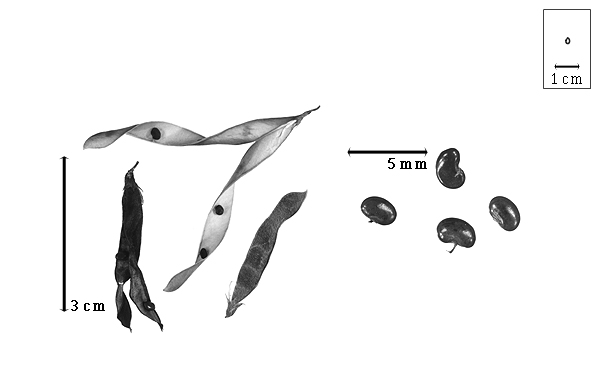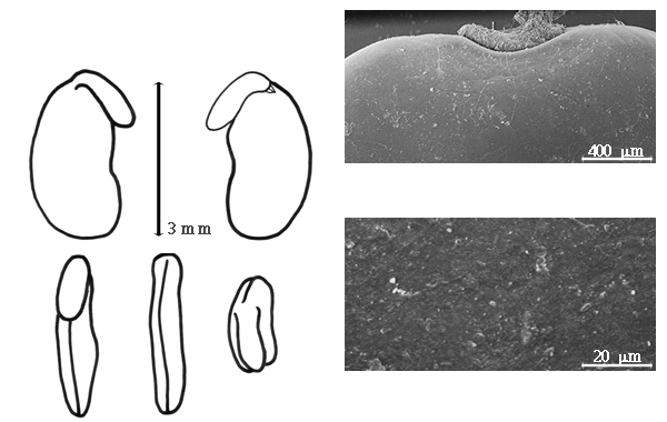 Seed: 2.7–5 mm long; 1.7–3 mm wide; 1.4–2.5 mm thick; not overgrown; not angular; symmetrical, or asymmetrical; reniform; terete to compressed; with surface smooth; with visible radicle and cotyledon lobes, or without visible radicle and cotyledon lobes; without external groove between radicle and cotyledon lobes; without hilar sinus; without umbo on seed faces; without medial ridge on each face. Cuticle not exfoliating; not inflated; not wrinkled. Testa present; without pieces of adhering epicarp; not adhering to endocarp; free from endocarp; glossy to dull; not modified by a bloom; colored; monochrome, or mottled; with frequent mottles; brown; with brown overlay (darker); glabrous; not smooth; with recessed features; striate, or pitted with small separate pits; coriaceous to chartaceous. Pleurogram absent. Pseudopleurogram absent. Fracture lines absent. Rim absent. Wing(s) absent. Raphe not visible. Hilum present; visible, or partially concealed; concealed by aril; with faboid split; with the lips of the faboid split the same color as the rest of the hilum; larger than punctiform; 1–1.4 mm long; with curved outline; circular to elliptic; apical according to radicle tip but marginal according to seed length; recessed; within rim, or within corona; corona color darker than testa; rim color darker than testa. Lens discernible; 0.5–0.7 mm long; with margins straight; linear; not in groove of raphe; confluent with hilum; recessed; similar color as testa; darker than testa; brown; within rim, or within corona; corona color darker than testa; rim color darker than testa. Endosperm present; thick; not pluglike and not resembling tip of radicle; covering entire embryo; adnate to embryo. Cotyledons smooth, or not smooth; 1–3 grooves on each face; both outer faces convex; both the same thickness; both more or less of equal length; not folded; margin entire 180 degrees from base of radicle; similar at apex; partially concealing radicle, or not concealing radicle; notched at radicle; without lobes; with the interface division terminating at base of radicle; without margins recessed; yellow; inner face flat; glabrous on inner face. Embryonic axis oblique; oblique to length of seed; without a joint evident between the radicle and the cotyledons. Radicle differentiated from cotyledon; bulbose; lobe tip curved; oblique to cotyledons; centered between cotyledons; less than 1/2 length of cotyledons. Plumule rudimentary; glabrous.