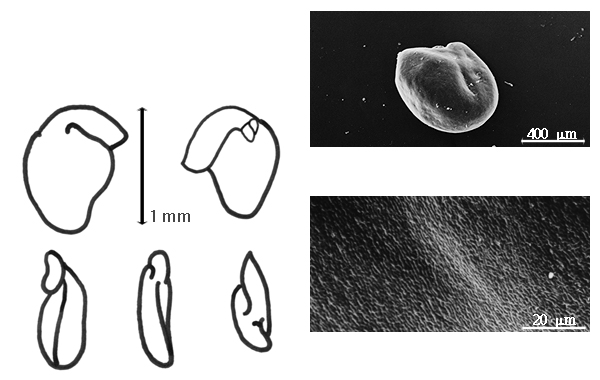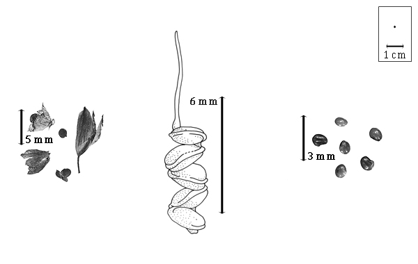 Seed: 1.5–1.8 mm long; 1.3 mm wide; 0.5 mm thick; not overgrown; not angular; asymmetrical; reniform; compressed; with visible radicle and cotyledon lobes; without external groove between radicle and cotyledon lobes; without hilar sinus; without umbo on seed faces; without medial ridge on each face. Cuticle not exfoliating; not inflated; not wrinkled. Testa present; without pieces of adhering epicarp; not adhering to endocarp; free from endocarp; dull; not modified by a bloom; colored; monochrome; reddish brown; glabrous; smooth; coriaceous. Pleurogram absent. Pseudopleurogram absent. Fracture lines absent. Rim absent. Wing(s) absent. Raphe not visible. Hilum present; visible; with faboid split; with the lips of the faboid split the same color as the rest of the hilum; punctiform; between cotyledon and radicle lobe; flush; not within corona, halo, or rim, or within halo; halo darker than testa. Lens discernible; with margins curved; elliptic; not in groove of raphe; adjacent to hilum; mounded; dissimilar color from testa; darker than testa; black; not within corona, halo, or rim. Endosperm present; thin; not pluglike and not resembling tip of radicle; covering entire embryo; adnate to testa. Cotyledons smooth; both outer faces convex; both the same thickness; both more or less of equal length; not folded; margin entire 180 degrees from base of radicle; differing at apex (1 concealed by overarching radicle and other auriculate and concealing radicle); partially concealing radicle; entire over radicle; without lobes; with the interface division terminating at base of radicle; without margins recessed; yellow; inner face flat; glabrous on inner face. Embryonic axis deflexed; oblique to length of seed; without a joint evident between the radicle and the cotyledons. Radicle differentiated from cotyledon; linear; lobe tip straight; deflexed and parallel to cotyledon length, or deflexed and parallel to cotyledon width; not centered between cotyledons (radicle outside 1 cotyledon and inside other, therefore junctions for each cotyledon different); 1/2 to nearly length of cotyledons. Plumule moderately developed; glabrous.