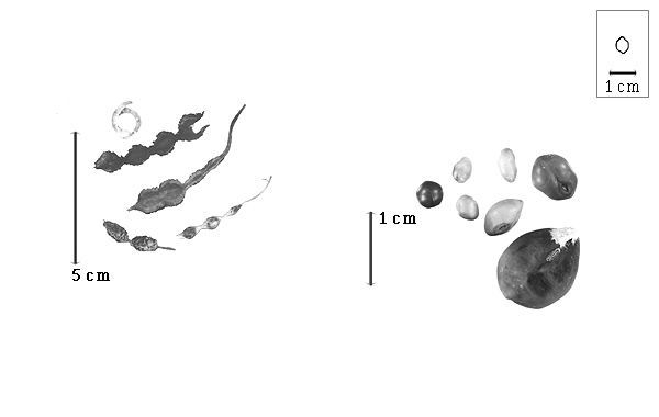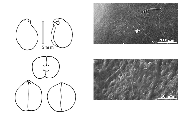 Seed: 3–13 mm long; 2–10 mm wide; 2–8 mm thick; not overgrown; not angular, or angular; symmetrical; ovate, or elliptic to circular (nearly), or rhombic; terete to compressed; with surface smooth; without visible radicle and cotyledon lobes; without hilar sinus; without umbo on seed faces; without medial ridge on each face. Cuticle not exfoliating; not inflated; not wrinkled. Testa present; with pieces of adhering epicarp, or without pieces of adhering epicarp; partially adhering to endocarp, or not adhering to endocarp; free from endocarp; dull; not modified by a bloom; colored; monochrome; brown, or tan; glabrous; smooth, or not smooth; with elevated features; bearing endocarp remnants; coriaceous to chartaceous. Pleurogram absent. Pseudopleurogram absent. Fracture lines absent. Rim absent. Wing(s) absent. Raphe visible; from hilum through lens to base of seed and terminating, or hilum to near base of seed and terminating; not bifurcating; color of testa, or darker than testa; flush, or raised. Hilum present; visible, or partially concealed; concealed by funicular remnant; with faboid split; with the lips of the faboid split the same color as the rest of the hilum; larger than punctiform; 0.7–3 mm long; with curved outline, or straight outline; elliptic; oblong; apical according to radicle tip but marginal according to seed length; recessed; within halo, or within rim; halo lighter than testa, or darker than testa; rim color of testa, or lighter than testa, or darker than testa. Lens discernible, or not discernible; 0.1–2 mm long; with margins straight; linear, or triangular; in groove of raphe, or not in groove of raphe; confluent with hilum; flush; similar color as testa; darker than testa; not within corona, halo, or rim. Endosperm present, or absent; thick, or thin; not pluglike and not resembling tip of radicle; covering entire embryo; adnate to testa. Cotyledons smooth, or not smooth; sulcate; both outer faces convex; both the same thickness; both more or less of equal length; with both folded, or not folded; sufficiently folded for inner face to touch itself; portions of inner folded face unequal; margin entire 180 degrees from base of radicle, or not entire 180 degrees from base of radicle (rarely); notched; similar at apex; completely concealing radicle, or partially concealing radicle, or not concealing radicle; entire over radicle, or notched at radicle, or split over radicle; with lobes; with lobes overlapping, or touching (auriculate), or not touching; with basal groin formed by lobes; with the interface division terminating at base of radicle; with margin(s) recessed; with 1 margin recessed, or both margins recessed; recessed on same side as radicle; yellow, or green, or tan, or yellow and brown; inner face flat; glabrous on inner face. Embryonic axis oblique, or right angled; oblique to length of seed, or perpendicular to length of seed; without a joint evident between the radicle and the cotyledons. Radicle differentiated from cotyledon; bulbose, or linear; lobe tip straight; oblique to cotyledons, or with 90 degree turn; centered between cotyledons; less than 1/2 length of cotyledons. Plumule rudimentary, or moderately developed; glabrous.
