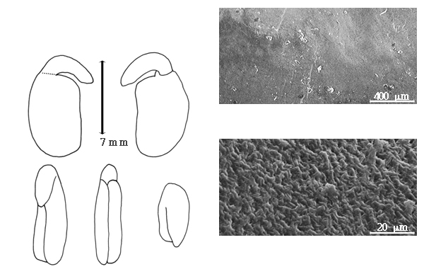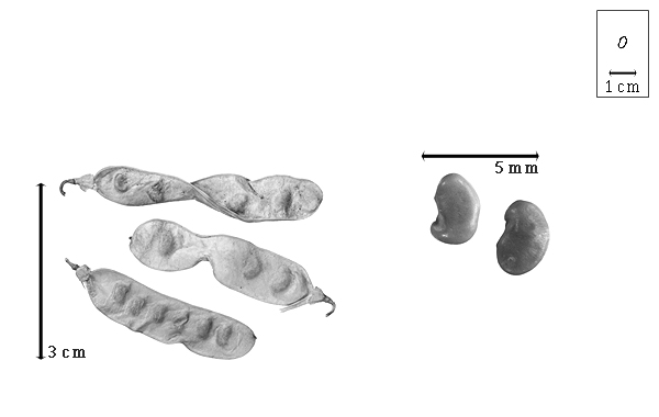 Seed: 3.5–4 mm long; 2–2.5 mm wide; 1.5–1.8 mm thick; not overgrown; not angular, or angular (somewhat); asymmetrical; oblong, or reniform; terete; with visible radicle and cotyledon lobes; without external groove between radicle and cotyledon lobes; without umbo on seed faces; without medial ridge on each face. Cuticle not exfoliating; not inflated; not wrinkled. Testa present; without pieces of adhering epicarp; not adhering to endocarp; free from endocarp; dull; not modified by a bloom; colored; monochrome; reddish brown, or tan (to reddish); glabrous; smooth; coriaceous. Pleurogram absent. Pseudopleurogram absent. Fracture lines absent. Rim absent. Wing(s) absent. Raphe not visible. Hilum present; visible, or fully concealed; concealed by funicular remnant; with faboid split; with the lips of the faboid split the same color as the rest of the hilum; punctiform; between cotyledon and radicle lobe; recessed; within rim; rim color of testa. Lens discernible; 1.4–1.8 mm long; with margins straight, or curved; oblong; oblong; not in groove of raphe; confluent with hilum; mounded; dissimilar color from testa; darker than testa; brown; not within corona, halo, or rim. Endosperm present; thin; not pluglike and not resembling tip of radicle; covering entire embryo; adnate to testa. Cotyledons smooth; both outer faces convex; both the same thickness; both more or less of equal length; not folded; margin entire 180 degrees from base of radicle; similar at apex; not concealing radicle; split over radicle; with lobes; without margins recessed; reddish tan; inner face flat; glabrous on inner face. Embryonic axis deflexed; oblique to length of seed; without a joint evident between the radicle and the cotyledons. Radicle differentiated from cotyledon; linear; deflexed and parallel to cotyledon length; centered between cotyledons; less than 1/2 length of cotyledons. Plumule rudimentary; glabrous.