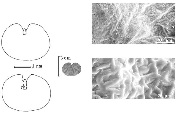 Seed: 30–35 mm long; 20–25 mm wide; 10–13 mm thick; not overgrown; not angular; asymmetrical; reniform; compressed; with surface smooth; without visible radicle and cotyledon lobes; without hilar sinus; without umbo on seed faces; without medial ridge on each face. Cuticle not exfoliating; not inflated; not wrinkled. Testa present; without pieces of adhering epicarp; not adhering to endocarp; free from endocarp; dull; not modified by a bloom; colored; mottled; brown (reddish and darker in streaks and patches); with brown overlay; glabrous; not smooth; with elevated features; rugose; coriaceous. Pleurogram absent. Pseudopleurogram absent. Fracture lines absent. Rim absent. Wing(s) absent. Raphe not visible. Hilum present; visible; without faboid split; punctiform; apical according to radicle tip but marginal according to seed length; recessed; not within corona, halo, or rim. Lens not discernible. Endosperm absent. Cotyledons smooth; both outer faces convex; both the same thickness; both more or less of equal length; not folded; margin entire 180 degrees from base of radicle; similar at apex; partially concealing radicle; with lobes; with lobes not touching; with the interface division terminating at base of radicle; without margins recessed; inner face flat; glabrous on inner face. Embryonic axis straight; perpendicular to length of seed; without a joint evident between the radicle and the cotyledons. Radicle differentiated from cotyledon; centered between cotyledons. Plumule well developed; glabrous.