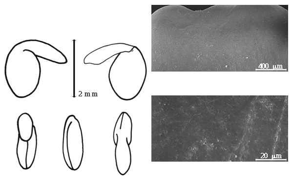Seed: 2.8–3.5 mm long; 2–2.5 mm wide; 1.2–1.8 mm thick; not overgrown; not angular, or angular; asymmetrical; oblong, or rectangular (more or less); compressed; with surface smooth; with visible radicle and cotyledon lobes; without external groove between radicle and cotyledon lobes; without hilar sinus; without umbo on seed faces; without medial ridge on each face. Cuticle not exfoliating; not inflated; not wrinkled. Testa present; without pieces of adhering epicarp; not adhering to endocarp; free from endocarp; glossy; not modified by a bloom; colored; monochrome, or streaked and mottled (large or minute); with frequent mottles; with frequent streaks; reddish to greenish brown, or green; with purple overlay; glabrous; smooth; coriaceous. Pleurogram absent. Pseudopleurogram absent. Fracture lines absent. Rim absent. Wing(s) absent. Raphe not visible. Hilum present; visible, or fully concealed; concealed by aril; with faboid split; with the lips of the faboid split the same color as the rest of the hilum; punctiform, or larger than punctiform; 0.3 mm long; with straight outline; oblong; apical at apex of radicle tip and between cotyledon and radicle lobe; recessed; within rim; rim color of testa (or nearly so). Lens discernible; 0.8 mm long; with margins straight, or curved; oblong; oblong; not in groove of raphe; confluent with hilum; mounded; similar color as testa; darker than testa; reddish brown; not within corona, halo, or rim. Endosperm present; thin; not pluglike and not resembling tip of radicle; covering entire embryo; adnate to testa. Cotyledons smooth; both outer faces convex; both the same thickness; both more or less of equal length; not folded; margin entire 180 degrees from base of radicle; similar at apex; not concealing radicle; split over radicle; with lobes; with the interface division terminating at base of radicle; without margins recessed; tan; inner face flat; glabrous on inner face. Embryonic axis deflexed; oblique to length of seed; without a joint evident between the radicle and the cotyledons. Radicle differentiated from cotyledon; bulbose; lobe tip straight; deflexed and parallel to cotyledon length; centered between cotyledons; 1/2 to nearly length of cotyledons. Plumule rudimentary; glabrous.