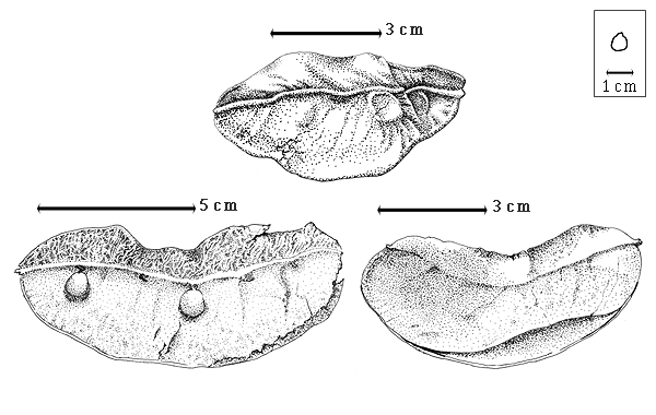 ; unilocular; 3.5–7.5 cm long; 2.5–4.5 cm wide; 0.3–0.5 cm thick; 2–9 times longer than wide; with deciduous androecial sheath; with deciduous corolla; with deciduous calyx; without orifice formed by curving of fruit or fruit segments; curved, or straight; not plicate; not twisted; symmetrical, or asymmetrical; nearly circular, or oblong, or falcate (slightly); with both sutures parallelly curved; not inflated; flattened; without beak; tapered at apex; aligned with longitudinal axis of fruit; rounded at base; aligned with longitudinal axis of fruit; with the apex and base uniform in texture; coriaceous; seed chambers externally faintly visible; margin not constricted; margin without sulcus; margin embellished; margin with wing(s); wing(s) present; wing(s) 2; wing(s) 6–11 mm wide; wing(s) sutural; wing(s) on 1 suture (ventral); substipitate to nonstipitate; with all layers dehiscing; splitting along suture(s). Dehiscence of valves along 1 suture (dorsally); apical and down; passive. Replum invisible. Epicarp dull; monochrome; brown; with surface texture uniform; glabrous; eglandular; without spines; not smooth; with elevated features; veined; reticulately veined; not tuberculate; not exfoliating; without cracks; without embedded tissue, much thicker than epicarp, running from base to apex. Mesocarp present; surface not veined; 1-layered; without balsamic vesicles; without reniform canals; fibrous throughout; coriaceous. Endocarp present; visible; dull; opaque; monochrome; tan; smooth; without adhering pieces of testa; partially subseptate; with septa composed of minute fringe of hairs; not exfoliating; remaining fused to mesocarp and epicarp; entire. Seed(s) 1–8; length transverse to fruit length; neither overlapping nor touching; in 1 series. Funiculus 0.1–6 mm long; of 1 length only; thick; once plicate. Aril absent.