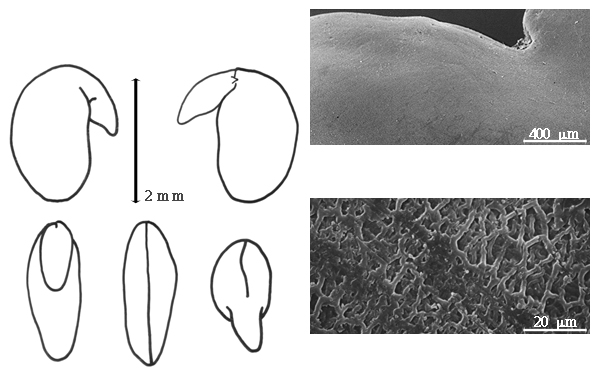 Seed: 2–2.7 mm long; 1.3–2 mm wide; 0.7 mm thick; not overgrown; not angular; asymmetrical; reniform; compressed; with surface smooth; with visible radicle and cotyledon lobes; without external groove between radicle and cotyledon lobes; without hilar sinus; without umbo on seed faces; without medial ridge on each face. Cuticle not exfoliating; not inflated; not wrinkled. Testa present; without pieces of adhering epicarp; not adhering to endocarp; free from endocarp; dull; not modified by a bloom, or modified by a bloom; colored; monochrome; dark reddish brown; glabrous; not smooth; with elevated features; shagreen; coriaceous. Pleurogram absent. Pseudopleurogram absent. Fracture lines absent. Rim absent. Wing(s) absent. Raphe visible; from hilum to lens; not bifurcating; darker than testa; black; flush. Hilum present; fully concealed; concealed by funicular remnant; without faboid split; punctiform; between cotyledon and radicle lobe; recessed; not within corona, halo, or rim. Lens discernible, or not discernible; with margins curved; circular; not in groove of raphe; adjacent to hilum; 0.8 mm from hilum; flush; dissimilar color from testa; darker than testa; black; not within corona, halo, or rim. Endosperm present; thin; not pluglike and not resembling tip of radicle; covering entire embryo; adnate to testa. Cotyledons smooth; both outer faces convex; both the same thickness; both more or less of equal length; not folded; margin entire 180 degrees from base of radicle; similar at apex; not concealing radicle; entire over radicle; without lobes; with the interface division terminating at base of radicle; without margins recessed; tan; inner face flat; glabrous on inner face. Embryonic axis deflexed; oblique to length of seed; without a joint evident between the radicle and the cotyledons. Radicle differentiated from cotyledon; linear; lobe tip straight; deflexed and parallel to cotyledon length; centered between cotyledons; less than 1/2 length of cotyledons. Plumule rudimentary; glabrous.