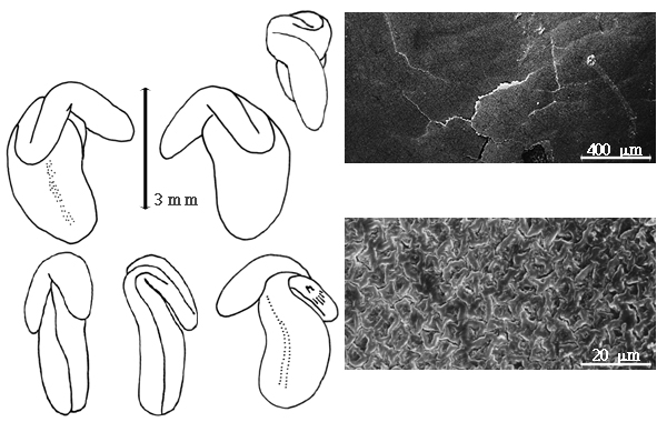 Seed: 6 mm long; 4.5 mm wide; 3 mm thick; not overgrown; not angular; asymmetrical; reniform; compressed; with visible radicle and cotyledon lobes; without external groove between radicle and cotyledon lobes; without hilar sinus; without umbo on seed faces; without medial ridge on each face. Cuticle not exfoliating; not inflated; not wrinkled. Testa present; without pieces of adhering epicarp; not adhering to endocarp; free from endocarp; dull; not modified by a bloom; colored; monochrome; dark reddish brown; glabrous; smooth; coriaceous. Pleurogram absent. Pseudopleurogram absent. Fracture lines absent. Rim absent. Wing(s) absent. Raphe visible; from hilum to lens; not bifurcating; color of testa; recessed. Hilum present; fully concealed, or partially concealed; concealed by radicle lobe; with faboid split; with the lips of the faboid split the same color as the rest of the hilum; larger than punctiform; 1 mm long; with curved outline; elliptic; marginal according to radicle tip; recessed; not within corona, halo, or rim. Lens discernible; with margins curved; circular; in groove of raphe; adjacent to hilum; 1.5 mm from hilum; recessed; dissimilar color from testa; darker than testa; black; not within corona, halo, or rim. Endosperm present; thin; not pluglike and not resembling tip of radicle; covering entire embryo; adnate to testa. Cotyledons not smooth; 1–3 grooves on each face (with a single central groove running the length of each cotyledon); both outer faces convex; both the same thickness; 1 longer than other; with only 1 folded; not sufficiently folded for inner face to touch itself; portions of inner folded face unequal; margin entire 180 degrees from base of radicle; similar at apex; not concealing radicle; 1 cotyledon scooped out to accommodate plicate radicle and other cotyledon entire; without lobes; with the interface division terminating at base of radicle; without margins recessed; tan; inner face flat; glabrous on inner face. Embryonic axis straight; oblique to length of seed; without a joint evident between the radicle and the cotyledons. Radicle differentiated from cotyledon; bulbose; lobe tip straight; with 360 degree turn and with 90 degree turn; centered between cotyledons; exceeding length of cotyledons. Plumule rudimentary; glabrous.