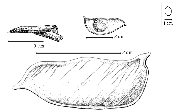 ; unilocular; 5 cm long; 2 cm wide; 0.1–0.9 cm thick (guestimate); 2–9 times longer than wide; with deciduous androecial sheath; with deciduous corolla; with deciduous calyx; without orifice formed by curving of fruit or fruit segments; straight; not plicate; not twisted; symmetrical, or asymmetrical; with 1 straight and 1 curved suture; widest near middle or D-shaped; not inflated; flattened; without beak; long tapered at apex; aligned with longitudinal axis of fruit; tapered at base; aligned with longitudinal axis of fruit; with the apex and base uniform in texture; ligneous; seed chambers externally invisible; margin not constricted; margin without sulcus; margin plain; wing(s) absent; with all layers dehiscing; splitting along suture(s). Dehiscence of valves along both sutures; medial and up and down; active; with valves enrolling. Replum invisible. Epicarp glossy; monochrome; dark to olive brown; with surface texture uniform; glabrous; eglandular; without spines; not smooth; with recessed features; not veined; not tuberculate; punctate; not exfoliating; without cracks; without embedded tissue, much thicker than epicarp, running from base to apex. Mesocarp present; surface not veined; 1-layered; without balsamic vesicles; without fibers; without reniform canals; solid; ligneous. Endocarp present; visible; dull; opaque; mottled; tan; with mottling more or less uniform; with pale reddish brown overlay; without adhering pieces of testa; nonseptate; not exfoliating; remaining fused to mesocarp and epicarp; entire. Seed(s) 1. Funiculus of 1 length only. Aril absent.