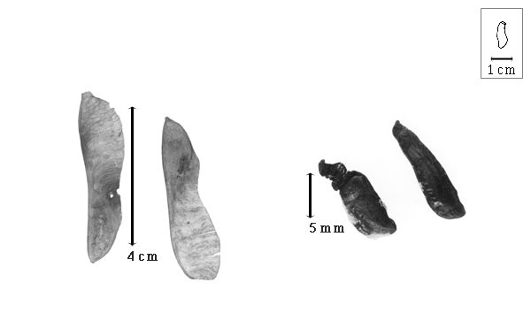 Seed: 13–15 mm long; 4–5 mm wide; 1.5–2 mm thick; not overgrown; angular; asymmetrical; irregular to samaroid; compressed; with surface smooth; without visible radicle and cotyledon lobes; without hilar sinus; without umbo on seed faces; without medial ridge on each face. Cuticle not exfoliating; not inflated; not wrinkled. Testa present; with pieces of adhering epicarp, or without pieces of adhering epicarp; not adhering to endocarp; free from endocarp; dull; not modified by a bloom; colored; monochrome; brown; glabrous; not smooth; with elevated features; wrinkled; chartaceous. Pleurogram absent. Pseudopleurogram absent. Fracture lines absent. Rim absent. Wing(s) absent. Raphe not visible. Hilum present; fully concealed; concealed by funicular remnant; larger than punctiform; 0.8–1.4 mm long; with curved outline; fusiform; subapical to radicle tip; flush; not within corona, halo, or rim. Lens not discernible. Endosperm absent. Cotyledons smooth; both outer faces convex; both the same thickness; both more or less of equal length; not folded; margin entire 180 degrees from base of radicle; similar at apex; partially concealing radicle; split over radicle; with lobes (small); with lobes not touching; without basal groin formed by lobes; with the interface division terminating at base of radicle; without margins recessed; brown; inner face flat; glabrous on inner face. Embryonic axis oblique; oblique to length of seed; without a joint evident between the radicle and the cotyledons. Radicle differentiated from cotyledon; triangular; lobe tip straight; oblique to cotyledons; centered between cotyledons; less than 1/2 length of cotyledons. Plumule moderately developed; glabrous.