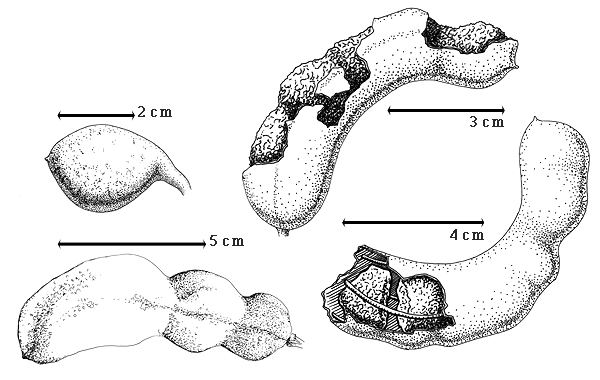 ; unilocular; 3–16 cm long; 1–3.5 cm wide; 2–3 cm thick; length less than twice as long as width to 2–9 times longer than wide; with deciduous androecial sheath; with deciduous corolla; with deciduous calyx; without orifice formed by curving of fruit or fruit segments; straight to curved; not plicate; not twisted; symmetrical, or asymmetrical; nearly circular, or falcate (or sausage-like onlong); with both sutures parallelly curved; not inflated; compressed to terete; without beak; tapered at apex; aligned with longitudinal axis of fruit to oblique with longitudinal axis of fruit; rounded at base; aligned with longitudinal axis of fruit to oblique with longitudinal axis of fruit (slightly); with the apex and base uniform in texture; ligneous; seed chambers externally invisible; margin constricted, or not constricted; margin constricted along both margins to constricted only on 1 margin; margin without sulcus; margin plain; wing(s) absent; substipitate; indehiscent. Replum invisible. Epicarp dull; monochrome; reddish tan, or brown (dirty); with surface texture uniform; glabrous; eglandular; without spines; not smooth; with elevated features; not veined; not tuberculate; scaly; not exfoliating; without cracks; without embedded tissue, much thicker than epicarp, running from base to apex. Mesocarp present; surface not veined; 2-layered; without balsamic vesicles; without fibers; without reniform canals; with spongy layer over solid layer (pulpy when fresh and shrinking when dry and forming porous layerover solid layer); ligneous. Endocarp present; visible; glossy; opaque; monochrome; dark brown; without adhering pieces of testa; nonseptate (pulpy when fresh); not exfoliating; remaining fused to mesocarp and epicarp; entire. Seed(s) 1–10; length transverse to fruit length; neither overlapping nor touching; in 1 series. Funiculus 0.1–1 mm long; of 1 length only; thick; straight. Aril absent.