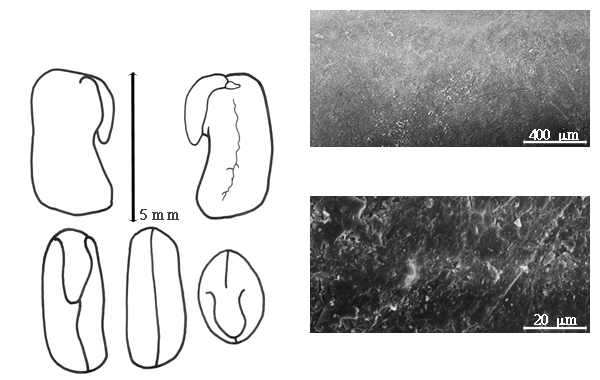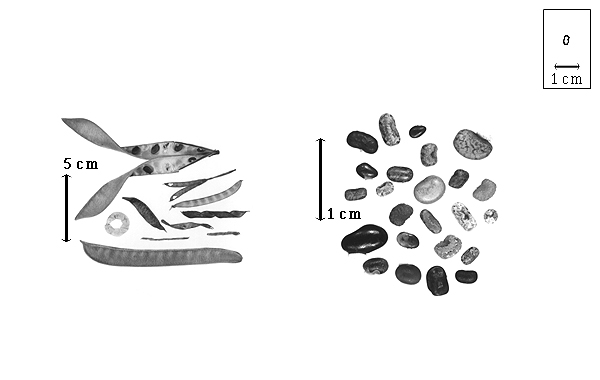 Seed: 3–10 mm long; 2–6 mm wide; 1.5–3 mm thick; not overgrown; angular, or not angular; symmetrical; ovate, or rectangular, or reniform; compressed; with surface smooth; without visible radicle and cotyledon lobes; with shallow hilar sinus, or without hilar sinus; without umbo on seed faces; without medial ridge on each face. Cuticle not exfoliating; not inflated; not wrinkled. Testa present; without pieces of adhering epicarp; not adhering to endocarp; free from endocarp; dull; not modified by a bloom; colored; monochrome, or mottled; with frequent mottles; black, or brown, or tan; with brown overlay; glabrous; smooth, or not smooth; with elevated features; reticulate; chartaceous. Pleurogram absent. Pseudopleurogram absent. Fracture lines absent. Rim absent. Wing(s) absent. Raphe not visible. Hilum present; visible, or partially concealed; concealed by aril; with faboid split; with the lips of the faboid split the same color as the rest of the hilum; larger than punctiform; 0.8–2.2 mm long; with curved outline; circular, or elliptic, or oval; apical according to radicle tip but marginal according to seed length; flush, or recessed; within corona; corona color lighter than testa and darker than testa. Lens discernible; ca. 1 mm long; with margins straight; linear; not in groove of raphe; confluent with hilum; recessed; same color as testa; brown; within halo; halo color darker than testa. Endosperm present, or absent; thin; not pluglike and not resembling tip of radicle; covering entire embryo; adnate to testa. Cotyledons smooth; both outer faces convex; both the same thickness; both more or less of equal length; not folded; margin entire 180 degrees from base of radicle; similar at apex; partially concealing radicle; notched at radicle; without lobes; with the interface division terminating at base of radicle; without margins recessed; white to yellow, or green; inner face wrinkled; glabrous on inner face. Embryonic axis right angled; perpendicular to length of seed; without a joint evident between the radicle and the cotyledons. Radicle differentiated from cotyledon; bulbose to linear; lobe tip straight, or curved; oblique to cotyledons to with 90 degree turn; centered between cotyledons; less than 1/2 length of cotyledons, or 1/2 to nearly length of cotyledons. Plumule rudimentary; glabrous.