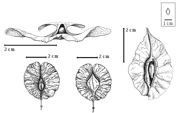 ; unilocular; 2.5–6.5 cm long; 2.2–4.8 cm wide; 0.4–0.5 cm thick; length less than twice as long as width; with deciduous androecial sheath; with deciduous corolla; with deciduous calyx; without orifice formed by curving of fruit or fruit segments; straight; not plicate; not twisted; asymmetrical; ovate to circular, or elliptic (broadly); not inflated; flattened; without beak; rounded at apex; aligned with longitudinal axis of fruit; tapered at base to rounded at base; aligned with longitudinal axis of fruit; with the apex and base uniform in texture; coriaceous; seed chambers externally visible (on only one side of fruit); seed chambers with the raised seed chambers not torulose; margin not constricted; margin without sulcus; margin embellished; margin with wing(s); wing(s) present; wing(s) 4 (in 2 unequal pairs); wing(s) 0.1–10 mm wide, or 11–24 mm wide; wing(s) valvular and sutural (1 pair sutural and the other valvular); wing(s) on both valves (1 on each valve); wing(s) on both sutures (ventral wing much larger than dorsal wing); stipitate to substipitate; with the stipe 0.1–11 mm long; indehiscent. Replum invisible. Epicarp dull; monochrome; yellowish brown; with surface texture uniform; glabrous; eglandular; without spines; smooth (except for reticulate wings); not veined; not tuberculate; not exfoliating; without cracks; without embedded tissue, much thicker than epicarp, running from base to apex. Mesocarp present; surface not veined; 1-layered (?); without balsamic vesicles; with fibers; without reniform canals; fibrous throughout; coriaceous. Endocarp present; visible; dull; opaque; monochrome; tan; without adhering pieces of testa; septate; not exfoliating; remaining fused to mesocarp and epicarp; entire. Seed(s) 1; length parallel with fruit length. Funiculus 0.1–0.5 mm long; of 1 length only; filiform; plicate. Aril absent.