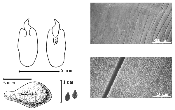 Seed: 8–15 mm long; 4–5.5 mm wide; 3–4 mm thick; not overgrown; angular; symmetrical; trapezoid; nearly terete; with surface smooth; without visible radicle and cotyledon lobes; without hilar sinus; without umbo on seed faces; without medial ridge on each face. Cuticle not exfoliating; not inflated; not wrinkled. Testa present; without pieces of adhering epicarp; not adhering to endocarp; free from endocarp; nearly glossy; not modified by a bloom; colored; monochrome; blackish brown; glabrous; not smooth; with recessed features, or elevated features; with cracks that are transversely reticulate; osseous. Pleurogram absent. Pseudopleurogram absent. Fracture lines present; transversely reticulate. Rim absent. Wing(s) absent. Raphe not visible. Hilum present; fully concealed; concealed by funicular remnant; without faboid split; punctiform; marginal according to radicle tip; flush (in notch); not within corona, halo, or rim. Lens not discernible. Endosperm present; thick; not pluglike and not resembling tip of radicle; adnate to embryo. Cotyledons smooth; both outer faces convex; both the same thickness; both more or less of equal length; not folded; margin entire 180 degrees from base of radicle; similar at apex; partially concealing radicle; with lobes; with lobes not touching; with the interface division terminating at base of radicle; without margins recessed; inner face flat; glabrous on inner face. Embryonic axis straight; parallel to length of seed; without a joint evident between the radicle and the cotyledons. Radicle differentiated from cotyledon; centered between cotyledons. Plumule well developed; glabrous.
