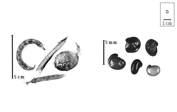 Seed: 3.2–6 mm long; 2–4 mm wide; 1.5–2.8 mm thick; not overgrown; not angular; asymmetrical; reniform (or nearly so); compressed; with visible radicle and cotyledon lobes; without external groove between radicle and cotyledon lobes; without umbo on seed faces; without medial ridge on each face. Cuticle not exfoliating; not inflated; not wrinkled. Testa present; without pieces of adhering epicarp; not adhering to endocarp; free from endocarp; dull, or glossy; not modified by a bloom, or modified by a bloom; colored; monochrome, or bichrome; greenish or reddish black, or black, or brown (yellow, orange, or brown), or purple, or orange; glabrous; not smooth, or smooth; with elevated features; blistered cuticle (exudate); coriaceous. Pleurogram absent. Pseudopleurogram absent. Fracture lines absent. Rim absent. Wing(s) absent. Raphe not visible, or visible; from hilum through lens and terminating before base of seed; not bifurcating; color of testa, or darker than testa; brown; raised. Hilum present; partially concealed; concealed by funicular remnant, or wing; with faboid split; with the lips of the faboid split the same color as the rest of the hilum; punctiform; between cotyledon and radicle lobe; recessed; within rim; rim color of testa. Lens discernible, or not discernible; with margins curved; circular; not in groove of raphe; adjacent to hilum; 0.5 mm from hilum; mounded; same color as testa, or similar color as testa; darker than testa; black, or brown; not within corona, halo, or rim. Endosperm present; thin; not pluglike and not resembling tip of radicle; covering entire embryo; adnate to testa, or embryo. Cotyledons smooth; both outer faces convex; both the same thickness; 1 longer than other; not folded; margin entire 180 degrees from base of radicle; similar at apex; completely concealing radicle; entire over radicle; without lobes; with the interface division terminating at base of radicle; without margins recessed; tan; inner face flat; glabrous on inner face. Embryonic axis deflexed; oblique to length of seed; without a joint evident between the radicle and the cotyledons. Radicle differentiated from cotyledon; linear; lobe tip straight; deflexed and parallel to cotyledon width; not centered between cotyledons (radicle outside 1 cotyledon and inside other, therefore junctions for each cotyledon different); less than 1/2 length of cotyledons. Plumule moderately developed; glabrous.