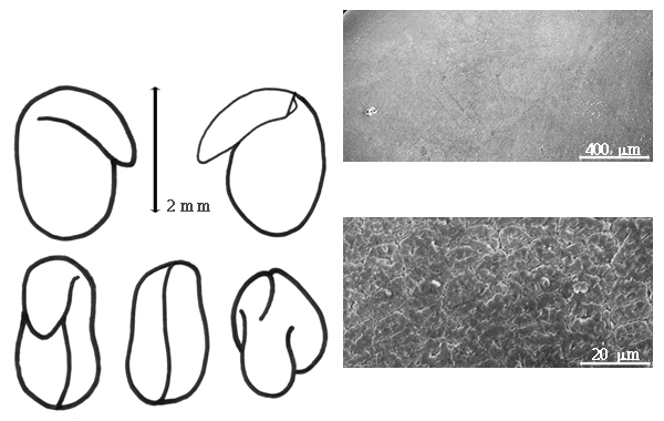 Seed: 0.8–5 mm long; 0.8–3 mm wide; not overgrown; not angular; symmetrical, or asymmetrical; circular, or mitaform, or oblong, or pyriform, or quadrangular, or reniform, or rhombic, or triangular; terete, or compressed, or flattened; with visible radicle and cotyledon lobes, or without visible radicle and cotyledon lobes; without external groove between radicle and cotyledon lobes; without umbo on seed faces; without medial ridge on each face. Cuticle not exfoliating; not inflated; not wrinkled. Testa present; without pieces of adhering epicarp; not adhering to endocarp; free from endocarp; glossy, or dull; not modified by a bloom; colored; monochrome, or mottled, or streaked; with frequent mottles; with frequent streaks; black (to reddish, greenish, purplish, yellowish, dark, or reddish), or green (yellowish to pale), or red, or tan, or yellow (to lemon); with black overlay, or brown overlay (various shades), or purple overlay; glabrous; smooth, or not smooth; with elevated features, or recessed features; shagreen, or tuberculate (minutely), or warty (finely), or wrinkled; pitted with small separate pits; coriaceous. Pleurogram absent. Pseudopleurogram absent. Fracture lines absent. Rim absent. Wing(s) absent. Raphe not visible. Hilum present; visible; with faboid split; with the lips of the faboid split the same color as the rest of the hilum; punctiform; between cotyledon and radicle lobe; not within corona, halo, or rim. Endosperm present; thin; not pluglike and not resembling tip of radicle; covering entire embryo. Cotyledons smooth; both outer faces convex; both the same thickness; both more or less of equal length; not folded; margin entire 180 degrees from base of radicle; similar at apex; not concealing radicle; entire over radicle; without lobes; with the interface division terminating at base of radicle; without margins recessed; inner face flat; glabrous on inner face. Embryonic axis deflexed; oblique to length of seed; without a joint evident between the radicle and the cotyledons. Radicle differentiated from cotyledon; bulbose, or linear; lobe tip straight; deflexed and parallel to cotyledon length; centered between cotyledons; 1/2 to nearly length of cotyledons, or equaling length of cotyledons. Plumule rudimentary; glabrous.