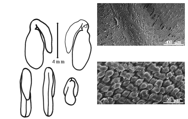 Seed: 1.5–5 mm long; 0.5–3 mm wide; 0.5–1.6 mm thick; not overgrown; angular, or not angular; asymmetrical; mitaform, or oblong, or ovate, or quadrangular, or rectangular, or rhombic, or elliptic, or linear, or circular (sub); compressed; with visible radicle and cotyledon lobes; without external groove between radicle and cotyledon lobes; without umbo on seed faces; without medial ridge on each face. Cuticle not exfoliating; not inflated; not wrinkled. Testa present; without pieces of adhering epicarp; not adhering to endocarp; free from endocarp; dull; not modified by a bloom; colored; monochrome, or mottled and streaked; with frequent mottles, or infrequent mottles; with frequent streaks, or infrequent streaks; yellowish, greenish, or dark brown, or yellow (or pale), or orange, or green (grayish); with black overlay, or brown overlay; glabrous; not smooth, or smooth; with elevated features; tuberculate, or wrinkled, or verrucose; coriaceous. Pleurogram absent. Pseudopleurogram absent. Fracture lines absent. Rim absent. Wing(s) absent. Raphe not visible. Hilum present; visible, or partially concealed; concealed by funicular remnant, or wing; with faboid split; with the lips of the faboid split the same color as the rest of the hilum; punctiform; between cotyledon and radicle lobe; recessed; not within corona, halo, or rim. Lens not discernible, or discernible; with margins straight, or curved; triangular, or irregular; circular, or irregular; not in groove of raphe; adjacent to hilum; 0.1–0.3 mm from hilum; mounded; similar color as testa; darker than testa; reddish brown; not within corona, halo, or rim. Endosperm present; thin, or thick; not pluglike and not resembling tip of radicle; covering entire embryo; adnate to testa. Cotyledons smooth; both outer faces convex; both the same thickness; both more or less of equal length; not folded; margin entire 180 degrees from base of radicle; similar at apex; not concealing radicle; entire over radicle; without lobes; with the interface division terminating at base of radicle; without margins recessed; yellow, or tan; inner face flat; glabrous on inner face. Embryonic axis deflexed; oblique to length of seed; without a joint evident between the radicle and the cotyledons. Radicle differentiated from cotyledon; linear, or bulbose; lobe tip straight; deflexed and parallel to cotyledon length; centered between cotyledons; less than 1/2 length of cotyledons, or 1/2 to nearly length of cotyledons. Plumule moderately developed; glabrous.