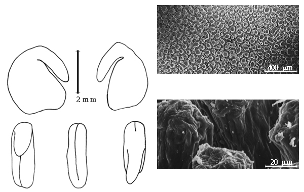 Seed: 3–3.5 mm long; 2.8–3.2 mm wide; 1.5–2.5 mm thick; not overgrown; not angular, or angular (to somewhat); asymmetrical; oblong, or reniform; compressed; with surface smooth; without visible radicle and cotyledon lobes; without hilar sinus; without umbo on seed faces; without medial ridge on each face. Cuticle not exfoliating; not inflated; not wrinkled. Testa present; without pieces of adhering epicarp, or with pieces of adhering epicarp (occasionally); not adhering to endocarp; free from endocarp; dull; not modified by a bloom; colored; monochrome, or streaked and mottled; with frequent mottles; with frequent streaks; brown (reddish), or tan; with black overlay; glabrous; not smooth (and distinctly grooved between cotyledons especially opposite from hilum); with elevated features; tuberculate; coriaceous. Pleurogram absent. Pseudopleurogram absent. Fracture lines absent. Rim absent. Wing(s) absent. Raphe not visible. Hilum present; partially concealed; concealed by funicular remnant; with faboid split; with the lips of the faboid split the same color as the rest of the hilum; punctiform; marginal according to radicle tip, or between cotyledon and radicle lobe; recessed; not within corona, halo, or rim. Lens obviously or faintly discernible, or not discernible; with margins curved; circular, or elliptic; not in groove of raphe; adjacent to hilum; 0.5 mm from hilum; mounded; same color as testa, or similar color as testa, or dissimilar color from testa; lighter than testa, or darker than testa; reddish brown, or tan (reddish), or black; not within corona, halo, or rim. Endosperm present; thick; not pluglike and not resembling tip of radicle; covering entire embryo; adnate to embryo. Cotyledons smooth; both outer faces convex; both the same thickness; both more or less of equal length; not folded; margin entire 180 degrees from base of radicle; similar at apex; not concealing radicle; entire over radicle; without lobes; with the interface division terminating at base of radicle; without margins recessed; tan; inner face flat; glabrous on inner face. Embryonic axis deflexed; oblique to length of seed; without a joint evident between the radicle and the cotyledons. Radicle differentiated from cotyledon; linear; deflexed and parallel to cotyledon length; centered between cotyledons; less than 1/2 length of cotyledons. Plumule rudimentary; glabrous.