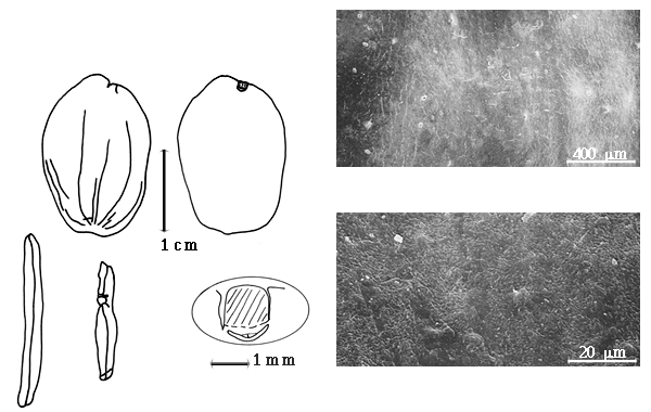 Seed: Ca. 20 mm long; ca. 14 mm wide; ca. 3.5 mm thick; not overgrown; not angular; symmetrical; ovate; flattened; with surface wrinkled, or grooved; longitudinal; without visible radicle and cotyledon lobes; without hilar sinus; without umbo on seed faces; without medial ridge on each face. Cuticle not exfoliating; not inflated; not wrinkled. Testa present; without pieces of adhering epicarp; not adhering to endocarp; free from endocarp; dull to glossy; not modified by a bloom; colored; mottled; with infrequent mottles; brown; with darker brown overlay; glabrous; not smooth; with elevated features; wrinkled. Pleurogram absent. Pseudopleurogram absent. Fracture lines absent. Rim absent. Wing(s) absent. Raphe not visible. Hilum present; fully concealed; concealed by funicular remnant; with faboid split; with the lips of the faboid split lighter colored than the rest of the hilum and therefore conspicuous; larger than punctiform; ca. 4.5 mm long; with curved outline; elliptic; apical at apex of radicle tip; raised; within rim; rim color darker than testa. Lens not discernible. Endosperm absent. Cotyledons not smooth; 5–7-branched grooves (from veins of testa) on each face; both outer faces convex; both the same thickness; both more or less of equal length; not folded; margin not entire 180 degrees from base of radicle; notched; similar at apex; not concealing radicle; notched at radicle; with lobes; with lobes not touching; without basal groin formed by lobes; with the interface division terminating at base of radicle; without margins recessed; tan; inner face flat; glabrous on inner face. Embryonic axis straight; parallel to length of seed; with a joint evident between the radicle and the cotyledons. Radicle differentiated from cotyledon; truncate; lobe tip straight; straight with embryonic axis; centered between cotyledons; less than 1/2 length of cotyledons. Plumule rudimentary; glabrous.