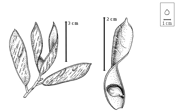 ; unilocular; 3.5–5 cm long; 0.8–1 cm wide; 0.1–0.4 cm thick; 2–9 times longer than wide; with deciduous androecial sheath; with deciduous corolla; with deciduous calyx; without orifice formed by curving of fruit or fruit segments; straight; not plicate; not twisted; asymmetrical; oblong; not inflated; compressed; without beak; short long tapered at apex; aligned with longitudinal axis of fruit; rounded at base; oblique with longitudinal axis of fruit; with the apex and base uniform in texture; ligneous; seed chambers externally invisible; margin not constricted; margin without sulcus; margin plain; wing(s) absent; substipitate; with all layers dehiscing; splitting along suture(s). Dehiscence of valves along both sutures (?); active; with valves separately enrolling. Replum invisible. Epicarp glossy; monochrome; brown; with surface texture uniform; glabrate; with hairs erect; with simple hairs; eglandular; without spines; not smooth; with elevated features; not veined; not tuberculate; obliquely striate; not exfoliating; without cracks; without embedded tissue, much thicker than epicarp, running from base to apex. Mesocarp present; surface not veined; 1-layered; without balsamic vesicles; without fibers; without reniform canals; solid; ligneous. Endocarp present; visible; dull; opaque; monochrome; greenish tan; without adhering pieces of testa; nonseptate; not exfoliating; remaining fused to mesocarp and epicarp; entire. Seed(s) 1 (near base); length oblique to fruit length. Funiculus 0.1–1 mm long; of 1 length only; flattened (with deltoid base); straight. Aril absent.