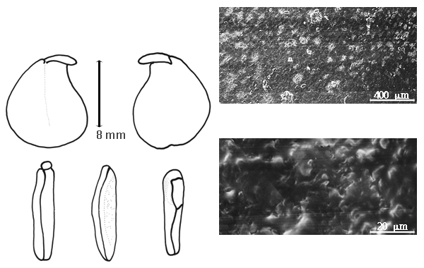 Seed: 14–19 mm long; 8–12 mm wide; 7–10 mm thick; not overgrown; angular, or not angular; asymmetrical; oblong, or obovate; quadrangular, or compressed; with surface smooth; without visible radicle and cotyledon lobes; without hilar sinus; without umbo on seed faces; without medial ridge on each face. Cuticle not exfoliating; not inflated; not wrinkled. Testa present; with pieces of adhering epicarp; not adhering to endocarp; free from endocarp; dull; not modified by a bloom; colored; monochrome; black to brown (dark); glabrous; smooth and not smooth; with elevated features; bearing endocarp remnants; chartaceous. Pleurogram absent. Pseudopleurogram absent. Fracture lines absent. Rim absent. Wing(s) absent. Raphe not visible. Hilum present; fully concealed; concealed by aril; larger than punctiform; 3–3.5 mm long; with curved outline; elliptic; subapical to radicle tip; recessed; not within corona, halo, or rim. Lens not discernible. Endosperm present; thick; not pluglike and not resembling tip of radicle; covering entire embryo; adnate to testa. Cotyledons smooth, or not smooth; convoluted; outer face of one cotyledon concave and other cotyledon convex; both the same thickness; both more or less of equal length; not folded; margin entire 180 degrees from base of radicle; similar at apex; partially concealing radicle; notched at radicle; with lobes; with lobes overlapping; with basal groin formed by lobes; with the interface division terminating at base of radicle; without margins recessed; brown; inner face wavy; glabrous on inner face. Embryonic axis oblique; oblique to length of seed; without a joint evident between the radicle and the cotyledons. Radicle differentiated from cotyledon; bulbose; lobe tip curved; oblique to cotyledons; centered between cotyledons; less than 1/2 length of cotyledons. Plumule rudimentary; glabrous.