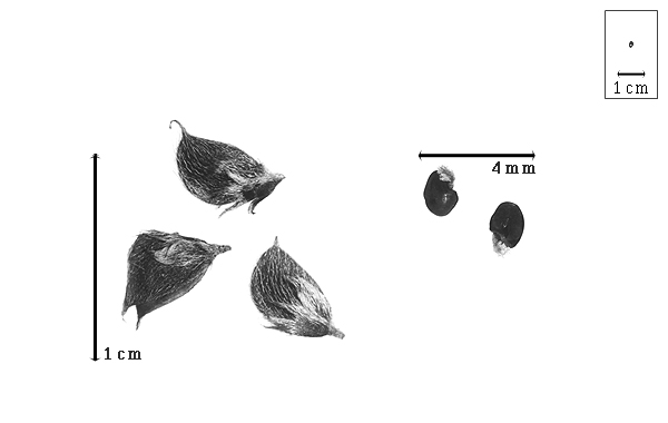 ; unilocular; 0.6–0.7 cm long; 0.3–0.35 cm wide; 0.14–0.16 cm thick; length less than twice as long as width; with deciduous androecial sheath; with deciduous corolla; with persistent calyx; with calyx shorter than fruit; without orifice formed by curving of fruit or fruit segments; straight; not plicate; not twisted; asymmetrical; with 1 straight and 1 curved suture; widest near middle or D-shaped; not inflated; compressed; without beak; short tapered at apex; aligned with longitudinal axis of fruit; short tapered at base; oblique with longitudinal axis of fruit; with the apex and base uniform in texture; membranous; seed chambers externally invisible; margin not constricted; margin without sulcus; margin plain; wing(s) absent; nonstipitate; with all layers dehiscing; splitting along suture(s). Dehiscence of valves along 1 suture; apical and down; active; with valves revolute. Replum invisible. Epicarp dull; monochrome; dark reddish brown; with surface texture uniform; pubescent and indurate; with hairs appressed; with 1 type of pubescence; with pubescence gray; with pubescence uniformly distributed; with simple hairs; stiff; with hair bases plain; eglandular; without spines; not smooth; with elevated features; veined; faintly, transversely veined relative to fruit length; not tuberculate; not exfoliating; without cracks; without embedded tissue, much thicker than epicarp, running from base to apex. Mesocarp absent. Endocarp present; visible; dull; opaque; monochrome; grayish brown, or gray; smooth; without adhering pieces of testa; nonseptate; chartaceous; not exfoliating; remaining fused to epicarp; without wings; entire. Seed(s) 1, or 2; length parallel with fruit length; neither overlapping nor touching, or overlapping and touching; in 1 series. Funiculus of 1 length only; flattened; straight. Aril present; fleshy; when fleshy topknotlike; fimbriate; covering less than 1/2 of seed; reddish brown.