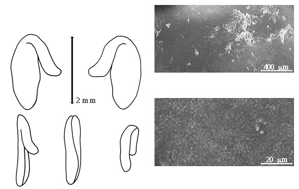 Seed: 2.7 mm long; 1.6 mm wide; 0.8 mm thick; not overgrown; not angular; asymmetrical; reniform; compressed; with surface smooth; without visible radicle and cotyledon lobes; without hilar sinus; without umbo on seed faces; without medial ridge on each face. Cuticle not exfoliating; not inflated; not wrinkled. Testa present; without pieces of adhering epicarp; not adhering to endocarp; free from endocarp; glossy; not modified by a bloom; colored; monochrome; dark reddish brown; glabrous; smooth, or not smooth (occasionally); with recessed features; occasionally pitted with small separate pits; coriaceous. Pleurogram absent. Pseudopleurogram absent. Fracture lines absent. Rim absent. Wing(s) absent. Raphe not visible. Hilum present; partially concealed; concealed by aril; with faboid split; with the lips of the faboid split the same color as the rest of the hilum; larger than punctiform; 0.5 mm long; with curved outline; elliptic; subapical to radicle tip; recessed; not within corona, halo, or rim, or within rim (slight); rim color of testa. Lens discernible; with margins curved; circular; not in groove of raphe; adjacent to hilum; 0.3 mm from hilum; mounded; dissimilar color from testa; darker than testa; black; not within corona, halo, or rim. Endosperm present; thin; not pluglike and not resembling tip of radicle; covering entire embryo; adnate to testa. Cotyledons smooth; both outer faces convex; both the same thickness; both more or less of equal length; not folded; margin entire 180 degrees from base of radicle; similar at apex; not concealing radicle; split over radicle; with lobes; with the interface division terminating at base of radicle; without margins recessed; tan; inner face flat; glabrous on inner face. Embryonic axis deflexed; oblique to length of seed; without a joint evident between the radicle and the cotyledons. Radicle differentiated from cotyledon; linear; deflexed and parallel to cotyledon length; centered between cotyledons; 1/2 to nearly length of cotyledons. Plumule rudimentary; glabrous.