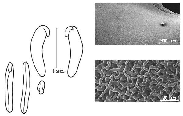 Seed: 10–12 mm long; 4.2–5.7 mm wide; 3.5–3.7 mm thick; not overgrown; not angular; asymmetrical; reniform to elliptic; terete to compressed (slightly); with surface smooth; without visible radicle and cotyledon lobes; without hilar sinus; without umbo on seed faces; without medial ridge on each face. Cuticle not exfoliating; not inflated; not wrinkled. Testa present; without pieces of adhering epicarp; not adhering to endocarp; free from endocarp; dull; not modified by a bloom; colored; monochrome; brown; glabrous; smooth; coriaceous. Pleurogram absent. Pseudopleurogram absent. Fracture lines absent. Rim absent. Wing(s) absent. Raphe not visible. Hilum present; partially concealed; concealed by aril; with faboid split; with the lips of the faboid split the same color as the rest of the hilum; larger than punctiform; 4.2–5 mm long; with curved outline; elliptic; marginal according to radicle tip; recessed; not within corona, halo, or rim. Lens discernible; 0.5–1.2 mm long; with margins straight; linear; not in groove of raphe; confluent with hilum; flush; similar color as testa; darker than testa; not within corona, halo, or rim, or within halo; halo color darker than testa. Endosperm present; thick; not pluglike and not resembling tip of radicle; covering entire embryo; adnate to testa, or embryo. Cotyledons not smooth; sulcate; both outer faces convex; both the same thickness; both more or less of equal length; not folded; margin entire 180 degrees from base of radicle; similar at apex; not concealing radicle; entire over radicle; without lobes; with the interface division terminating at base of radicle; without margins recessed; tan; inner face flat; glabrous on inner face. Embryonic axis oblique; oblique to length of seed; without a joint evident between the radicle and the cotyledons. Radicle differentiated from cotyledon; bulbose; lobe tip curved; oblique to cotyledons; centered between cotyledons; less than 1/2 length of cotyledons. Plumule rudimentary; glabrous.