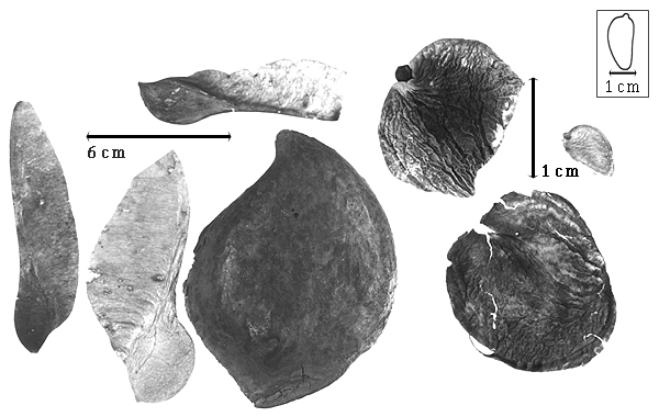 ; unilocular; 8.5–14 cm long; 2.5–8 cm wide; 0.6–3.5 cm thick; 2–9 times longer than wide, or length less than twice as long as width; with deciduous androecial sheath; with deciduous corolla; with deciduous calyx; without orifice formed by curving of fruit or fruit segments; straight, or curved (to slightly curved); not plicate; not twisted; asymmetrical, or symmetrical; circular, or samaroid; with both sutures parallelly curved to both sutures unequally curved; not inflated; seed chamber compressed to flattened (wing); without beak; rounded at apex, or short tapered at apex; oblique with longitudinal axis of fruit, or aligned with longitudinal axis of fruit; rounded at base; aligned with longitudinal axis of fruit; with the apex and base uniform in texture; ligneous, or drupaceous (V. guianensis J.B.C.F. Aublet); seed chambers externally visible; margin not constricted; margin without sulcus; margin embellished, or plain; margin with wing(s); wing(s) present, or absent; wing(s) 1; wing(s) 0.1–80 mm wide; wing(s) samaroid; wing(s) basal; wing(s) on 1 suture; nonstipitate; indehiscent. Replum invisible. Epicarp dull; monochrome; brown (brown to reddish); with surface texture uniform; glabrous; without spines; not smooth; with elevated features; veined; irregularly veined; not tuberculate; not exfoliating; without cracks; without embedded tissue, much thicker than epicarp, running from base to apex. Mesocarp present; thick (over seed chamber); surface uniformly veined; 1-layered; without balsamic vesicles; with fibers; without reniform canals; fibrous throughout; ligneous. Endocarp present; visible; dull; opaque; monochrome; brown (dark reddish); without adhering pieces of testa; nonseptate; coriaceous; exfoliating (with fused testa); separating from mesocarp; with wing(s) extending into epicarp, or without wings; entire. Seed(s) 1; length oblique to fruit length. Funiculus straight. Aril absent.