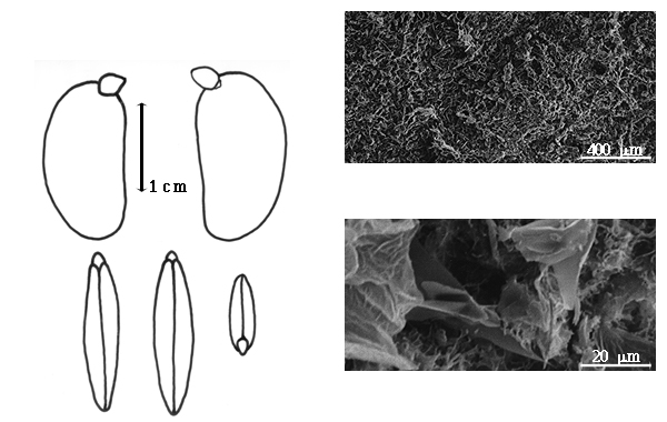 Seed: 15–65 mm long; 10–45 mm wide; 0.4–8 mm thick; not overgrown, or overgrown, 1 seed filling entire fruit cavity (V. guianensis); not angular; asymmetrical, or symmetrical; oblong, or obovate, or circular; compressed; with surface ridged; without visible radicle and cotyledon lobes; without hilar sinus; without umbo on seed faces; without medial ridge on each face. Cuticle not exfoliating; not inflated; not wrinkled. Testa absent (testa fused to endocarp and endocarp falling with embryo or not). Endosperm absent. Cotyledons not smooth; wrinkled; both outer faces convex; both the same thickness; both more or less of equal length; not folded; margin entire 180 degrees from base of radicle; similar at apex; not concealing radicle; notched at radicle; without lobes; with the interface division terminating at base of radicle; without margins recessed; tan (greenish); inner face flat; glabrous on inner face. Embryonic axis deflexed; oblique to length of seed, or parallel to length of seed; without a joint evident between the radicle and the cotyledons. Radicle differentiated from cotyledon; bulbose, or linear; deflexed and parallel to cotyledon width, or straight with embryonic axis (V. guianensis); centered between cotyledons; less than 1/2 length of cotyledons. Plumule rudimentary; glabrous.