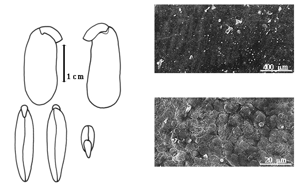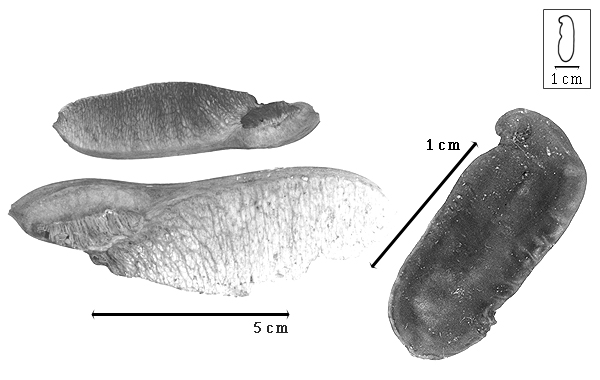 Seed: 20–25 mm long0.8–1 mm wide; 2.5–3 mm thick; not overgrown; not angular; asymmetrical; oblong, or reniform; compressed; with surface smooth; with visible radicle and cotyledon lobes; without external groove between radicle and cotyledon lobes; without hilar sinus; without umbo on seed faces; without medial ridge on each face. Cuticle not exfoliating; not inflated; not wrinkled. Testa present; without pieces of adhering epicarp; not adhering to endocarp; free from endocarp; glossy (more or less); not modified by a bloom; colored; monochrome; brown (reddish); glabrous; smooth; coriaceous. Pleurogram absent. Pseudopleurogram absent. Fracture lines absent. Rim absent. Wing(s) absent. Raphe visible; from hilum to near base of seed and terminating; not bifurcating; darker than testa; brown (dark reddish); recessed. Hilum present; partially concealed; concealed by funicular remnant, or wing; with faboid split; with the lips of the faboid split the same color as the rest of the hilum; larger than punctiform; 0.9 mm long; with curved outline; oval; between cotyledon and radicle lobe; recessed; not within corona, halo, or rim. Lens not discernible. Endosperm present. Cotyledons smooth; both outer faces convex; both the same thickness; both more or less of equal length; not folded; margin entire 180 degrees from base of radicle; similar at apex; not concealing radicle; entire over radicle; without lobes; with the interface division terminating at base of radicle; without margins recessed; tan; inner face flat; glabrous on inner face. Embryonic axis deflexed; oblique to length of seed; without a joint evident between the radicle and the cotyledons. Radicle differentiated from cotyledon; bulbose; lobe tip curved (slightly); deflexed and parallel to cotyledon width; centered between cotyledons; less than 1/2 length of cotyledons. Plumule rudimentary; glabrous.