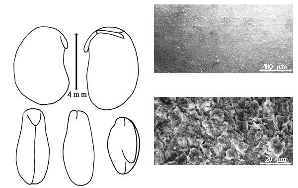 Seed: 6–8 mm long; 5–7 mm wide; 3.3–4.6 mm thick; not overgrown; not angular; symmetrical; elliptic to oblong; compressed; with surface smooth; without visible radicle and cotyledon lobes; without hilar sinus; without umbo on seed faces; without medial ridge on each face. Cuticle not exfoliating; not inflated; not wrinkled. Testa present; without pieces of adhering epicarp; not adhering to endocarp; free from endocarp; dull; not modified by a bloom; colored; mottled; with frequent mottles; brown; with brown overlay (darker); glabrous; not smooth; with elevated features; wrinkled; chartaceous. Pleurogram absent. Pseudopleurogram absent. Fracture lines absent. Rim absent. Wing(s) absent. Raphe not visible. Hilum present; fully concealed; concealed by funicular remnant; larger than punctiform; 0.9–1.8 mm long; with curved outline; elliptic, or oval; apical according to radicle tip but marginal according to seed length; flush; within corona; corona color lighter than testa. Lens discernible; 1–2 mm long; with margins straight; linear; not in groove of raphe; confluent with hilum; flush; similar color as testa; darker than testa; brown; not within corona, halo, or rim. Endosperm absent. Cotyledons smooth; both outer faces convex; both the same thickness; both more or less of equal length; not folded; margin entire 180 degrees from base of radicle; similar at apex; partially concealing radicle; split over radicle; with lobes; with lobes touching (auriculate) (barely); with the interface division terminating at base of radicle; with margin(s) recessed; with 1 margin recessed; recessed on same side as radicle; yellow to tan; inner face flat; glabrous on inner face. Embryonic axis oblique; oblique to length of seed; without a joint evident between the radicle and the cotyledons. Radicle differentiated from cotyledon; linear; lobe tip straight; oblique to cotyledons; centered between cotyledons; less than 1/2 length of cotyledons. Plumule moderately developed; glabrous.