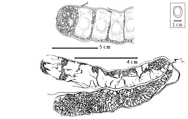 ; unilocular; 10–20 cm long; 2.5–4 cm wide; 0.8–2.5 cm thick; 2–9 times longer than wide; with deciduous androecial sheath; with deciduous corolla; with deciduous calyx; without orifice formed by curving of fruit or fruit segments; straight to curved; not plicate; not twisted; asymmetrical, or symmetrical; oblong, or falcate; with both sutures parallelly curved; not inflated; compressed; without beak; rounded at apex to short tapered at apex; aligned with longitudinal axis of fruit; short tapered at base; aligned with longitudinal axis of fruit; with the apex and base uniform in texture; ligneous; seed chambers externally visible, or invisible; margin constricted to not constricted; margin constricted along both margins; margin without sulcus; margin plain; wing(s) absent; substipitate; with the stipe 3–5 mm long; with all layers dehiscing; splitting along suture(s). Dehiscence of valves medial and up and down (but barely separating and with endocarp eventually falling from sutures as 1-seeded winged segments and leaving fibrous part of mesocarp attached to sutures); passive. Replum invisible. Epicarp dull; monochrome; dark brown; with surface texture uniform; pubescent but soon deciduous (when young, pubescence reddish brown), or glabrate (when mature); with hairs erect; with simple hairs; eglandular; without spines; not smooth; with elevated features; not veined; not tuberculate; shagreen; checking and exfoliating; without cracks; without embedded tissue, much thicker than epicarp, running from base to apex. Mesocarp present; surface not veined; 1-layered; without balsamic vesicles; without reniform canals; fibrous throughout and mealy (between and separating from fibers); ligneous. Endocarp present; visible; dull; opaque; bichrome; wings tan and brown (reddish, over seed chambers); smooth; without adhering pieces of testa; septate; not exfoliating; separating from mesocarp; separating into 1-seeded winged segments. Seed(s) 3–11; length transverse to fruit length; neither overlapping nor touching; in 1 series. Funiculus up to 35 mm long; of 1 length only; filiform; coiled. Aril absent.