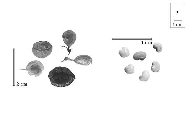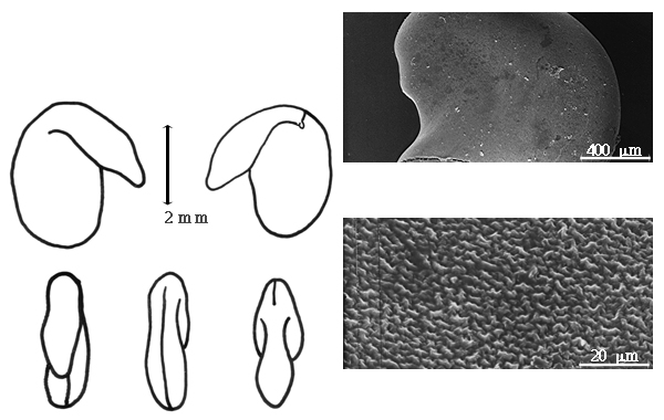 Seed: 3–4 mm long; 2.5–2.8 mm wide; 1.5–1.8 mm thick; not overgrown; not angular to angular (somewhat); asymmetrical; ovate, or rectangular; compressed; with visible radicle and cotyledon lobes; without external groove between radicle and cotyledon lobes; without umbo on seed faces; without medial ridge on each face. Cuticle not exfoliating; not inflated; not wrinkled. Testa present; without pieces of adhering epicarp; not adhering to endocarp; free from endocarp; dull; not modified by a bloom; colored, or clear; monochrome; salmon brown, or orange (light); glabrous; smooth; coriaceous. Pleurogram absent. Pseudopleurogram absent. Fracture lines absent. Rim absent. Wing(s) absent. Raphe not visible. Hilum present; visible, or fully concealed, or partially concealed; concealed by funicular remnant, or wing; with faboid split; with the lips of the faboid split the same color as the rest of the hilum; punctiform; between cotyledon and radicle lobe; recessed; within rim; rim color of testa, or darker than testa (green). Lens discernible; 0.8–1.5 mm long; with margins straight, or curved; oblong (with narrow extension or full body reaching to hilum); oblong (with narrow extension or full body reaching to hilum); not in groove of raphe; adjacent to hilum; mounded; dissimilar color from testa; darker than testa; brown; not within corona, halo, or rim. Endosperm present; thin; not pluglike and not resembling tip of radicle; covering entire embryo; adnate to testa. Cotyledons smooth; both outer faces convex; both the same thickness; both more or less of equal length; not folded; margin entire 180 degrees from base of radicle; similar at apex; not concealing radicle; entire over radicle; without lobes; with the interface division terminating at base of radicle; without margins recessed; yellow, or tan; inner face flat; glabrous on inner face. Embryonic axis deflexed; oblique to length of seed; without a joint evident between the radicle and the cotyledons. Radicle differentiated from cotyledon; bulbose; deflexed and parallel to cotyledon length; centered between cotyledons; less than 1/2 length of cotyledons. Plumule rudimentary; glabrous.