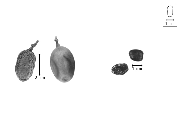 Seed: 14–25 mm long; 10–15 mm wide; 8–12 mm thick; not overgrown; not angular; symmetrical, or asymmetrical; oblong to ovate, or irregular, or reniform; terete; with surface smooth; without visible radicle and cotyledon lobes; with shallow hilar sinus; without umbo on seed faces; without medial ridge on each face. Cuticle not exfoliating; not inflated; not wrinkled. Testa present; with pieces of adhering epicarp, or without pieces of adhering epicarp; not adhering to endocarp; free from endocarp; dull; not modified by a bloom; colored; monochrome, or mottled; with infrequent mottles; black, or blue, or brown (dark, when mottled); with brown overlay (lighter); glabrous; smooth, or not smooth; with elevated features; wrinkled; coriaceous. Pleurogram absent. Pseudopleurogram absent. Fracture lines absent. Rim absent. Wing(s) absent. Raphe visible, or not visible; from hilum through lens to base of seed and terminating; not bifurcating; color of testa; flush, or raised (slightly). Hilum present; visible; with faboid split; with the lips of the faboid split the same color as the rest of the hilum; larger than punctiform; 2–2.5 mm long; with curved outline; elliptic to fusiform; apical according to radicle tip but marginal according to seed length; recessed; within halo; halo lighter than testa. Lens discernible; 3–4 mm long; with margins straight; linear; not in groove of raphe; confluent with hilum; flush; same color as testa, or similar color as testa; lighter than testa; brown; within halo; halo color lighter than testa. Endosperm present; thin; not pluglike and not resembling tip of radicle; covering entire embryo; adnate to testa and embryo. Cotyledons smooth; both outer faces convex; both the same thickness; both more or less of equal length; with both folded, or not folded; sufficiently folded for inner face to touch itself; portions of inner folded face unequal; margin entire 180 degrees from base of radicle; similar at apex; partially concealing radicle, or not concealing radicle; notched at radicle; without lobes; with margin(s) recessed, or without margins recessed; with both margins recessed; yellow; inner face flat; glabrous on inner face. Embryonic axis straight; oblique to length of seed, or parallel to length of seed; without a joint evident between the radicle and the cotyledons. Radicle differentiated from cotyledon; bulbose, or triangular; lobe tip straight; straight with embryonic axis; centered between cotyledons; less than 1/2 length of cotyledons. Plumule rudimentary; glabrous.