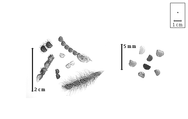 indehiscent; segments (articles) inconspicuous; segments (articles) 1.2–5 mm long; segments (articles) widest across seed area; segments (articles) with all essentially similar in shape; segments (articles) circular, or D-shaped. Epicarp dull; monochrome (with or without different colored reticulum); brown, or green, or tan, or yellow; with surface texture uniform; glabrous, or pubescent and indurate; with hairs erect; with 1 type of pubescence; pilose, or villous; with pubescence gray, or brown; with pubescence uniformly distributed; with simple hairs, or complex hairs; with plumose hairs, or bristle-like hairs, or setae; pliable; with hair bases plain; antrorse, or retrorse; straight at apex, or hooked at apex, or coiled at apex; glandular, or eglandular; with glandular dots; without spines; not smooth; with elevated features; veined, or not veined; reticulately veined; not tuberculate; glandular dotted; not exfoliating; without cracks; without embedded tissue, much thicker than epicarp, running from base to apex. Mesocarp absent. Endocarp present; visible; dull; opaque; monochrome; brown; spongy; without adhering pieces of testa; septate; with septa thicker than paper, firm; with septa eglandular; chartaceous; not exfoliating; remaining fused to epicarp; without wings; entire. Seed(s) 1–15; length parallel with fruit length; neither overlapping nor touching; in 1 series. Funiculus of 1 length only; thick; straight. Aril absent.