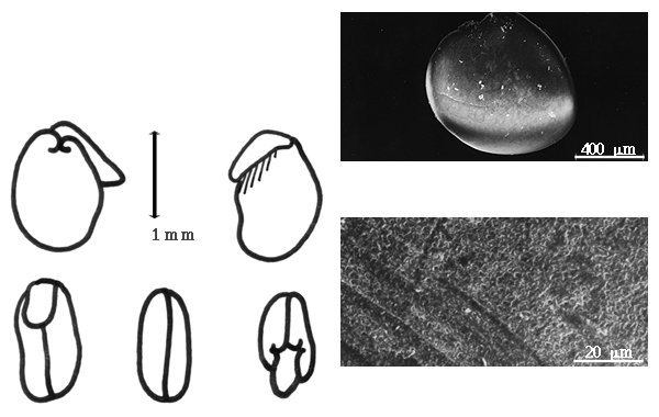 Seed: 1.5–2.3 mm long; 1–1.5 mm wide; 0.5–0.8 mm thick; not overgrown; angular, or not angular; asymmetrical; elliptic (reniform), or irregular (reniform), or reniform (with or without beak); compressed; with visible radicle and cotyledon lobes; without external groove between radicle and cotyledon lobes; without hilar sinus; without umbo on seed faces; without medial ridge on each face. Cuticle not exfoliating; not inflated; not wrinkled. Testa present; without pieces of adhering epicarp; not adhering to endocarp; free from endocarp; dull; not modified by a bloom; colored; monochrome, or mottled; with frequent mottles, or infrequent mottles; brown (to reddish-brown or purplish-brown), or tan; with red overlay; glabrous; smooth; coriaceous. Pleurogram absent. Pseudopleurogram absent. Fracture lines absent. Rim absent. Wing(s) absent. Raphe not visible. Hilum present; visible; with faboid split; with the lips of the faboid split the same color as the rest of the hilum; punctiform; between cotyledon and radicle lobe; flush; within rim, or within halo; halo lighter than testa; rim color lighter than testa. Lens discernible, or not discernible; with margins curved; 2 circular mounds separated by groove; not in groove of raphe; confluent with hilum (or at least to the hilar rim); mounded; dissimilar color from testa; darker than testa; reddish brown; not within corona, halo, or rim. Endosperm present; thick, or thin; not pluglike and not resembling tip of radicle; covering entire embryo; adnate to testa. Cotyledons smooth; both outer faces convex; both the same thickness; both more or less of equal length; not folded; margin entire 180 degrees from base of radicle; similar at apex; partially concealing radicle; split over radicle; with lobes; with lobes not touching; with the interface division terminating at base of radicle; without margins recessed; yellow; inner face flat; glabrous on inner face. Embryonic axis deflexed; oblique to length of seed; without a joint evident between the radicle and the cotyledons. Radicle differentiated from cotyledon; bulbose, or linear; lobe tip straight; deflexed and parallel to cotyledon width, or oblique to cotyledons; centered between cotyledons; less than 1/2 length of cotyledons, or 1/2 to nearly length of cotyledons. Plumule rudimentary; glabrous.