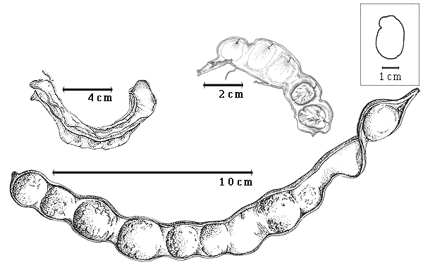 ; unilocular; 5–45 cm long; 1.2–2.5 cm wide; 1 cm thick; 2–9 times longer than wide, or more than 9 times longer than wide; with deciduous androecial sheath; with deciduous corolla; with deciduous calyx; without orifice formed by curving of fruit or fruit segments; straight, or curved, or 1-coiled; not plicate; not twisted; asymmetrical, or symmetrical; oblong, or falcate; with both sutures parallelly curved; not inflated; flattened to compressed; without beak; rounded at apex; aligned with longitudinal axis of fruit; rounded at base to tapered at base; aligned with longitudinal axis of fruit, or oblique with longitudinal axis of fruit; with the apex and base uniform in texture; leathery, or ligneous; seed chambers externally faintly visible; margin not constricted to constricted; margin constricted along both margins; margin without sulcus; margin plain; wing(s) absent; nonstipitate to substipitate; tardily with all layers dehiscing; splitting along suture(s). Dehiscence of valves along 1 suture; apical and down; active; with valves reflexing (along ventral margin, remaining attached to sutures). Replum invisible. Epicarp dull; monochrome; brown; with surface texture uniform; minutely pubescent and indurate to glabrate, or glabrous; with hairs erect; with simple hairs; eglandular; without spines; smooth, or not smooth; with elevated features; not veined; not tuberculate; shagreen; not exfoliating; without cracks, or with cracks (rarely); cracking transverse to fruit length; without embedded tissue, much thicker than epicarp, running from base to apex. Mesocarp present; surface not veined; 1-layered; without balsamic vesicles; without reniform canals; mealy and fibrous throughout; ligneous. Endocarp present; visible; dull; opaque; monochrome; reddish brown; smooth; without adhering pieces of testa; nonseptate, or septate (rarely); not exfoliating; remaining fused to mesocarp and epicarp; entire. Seed(s) 2–12; length transverse to fruit length; neither overlapping nor touching, or touching (especially when large); in 1 series. Funiculus 3–4 mm long; of 1 length only; thick; curved. Aril absent.