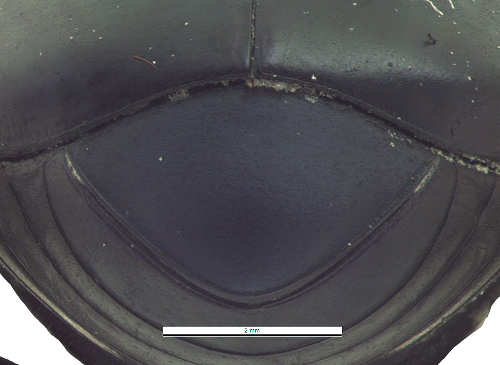 Total body length 10.0–17.0 mm (0.39–0.67 in). Body shape round (dorsal view); may be caked in dried dung. Color dark blue-black; weakly metallic. Eyes crescent shaped; longer than wide. Clypeusclypeus: