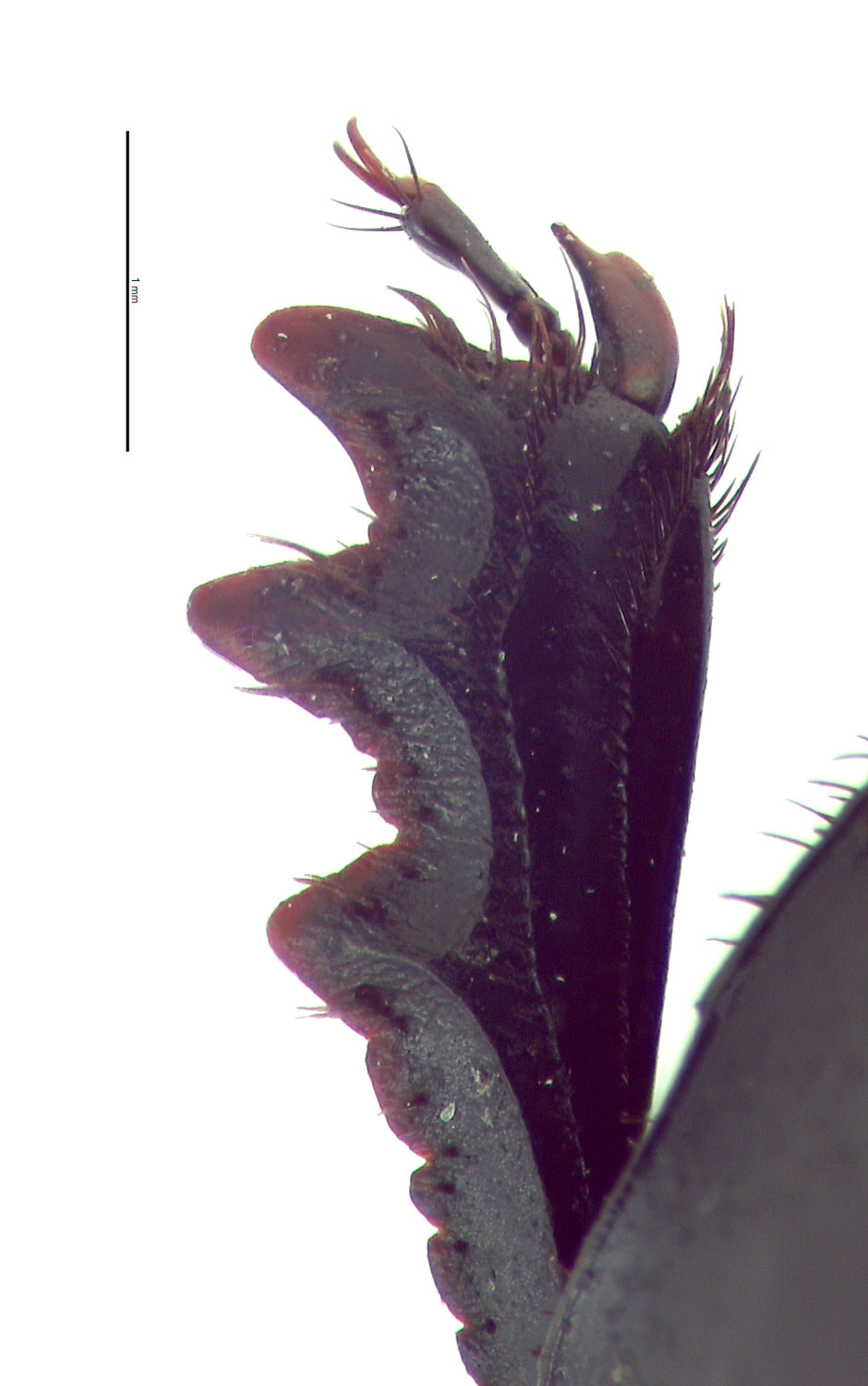 projecting, angular process on each side. Legs each with a single long, terminal setaseta: