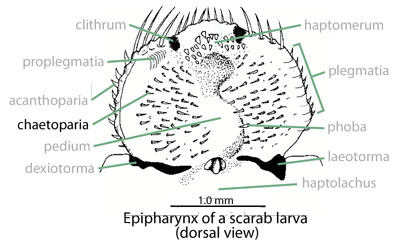 Blume R. 1981. Glaphyrocanthon viridis viridis (Beauvois): description of larva and notes on biology (Coleoptera : Scarabaeidae). The Coleopterists Bulletin 35: 235-238. full text (accessed 2015)): Grub C-shaped, hump-backed, cylindrical, whitish. Anal slit transversetransverse: