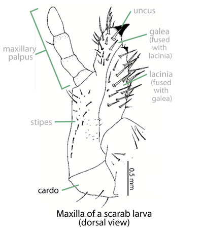 Ritcher P. 1966. White grubs and their allies: a study of North American scarabaeoid larvae. Oregon State University Monographs, Studies in Entomology 4: 1-219.): Grub C-shaped, not hump-backed, cylindrical, whitish. Cardocardo: