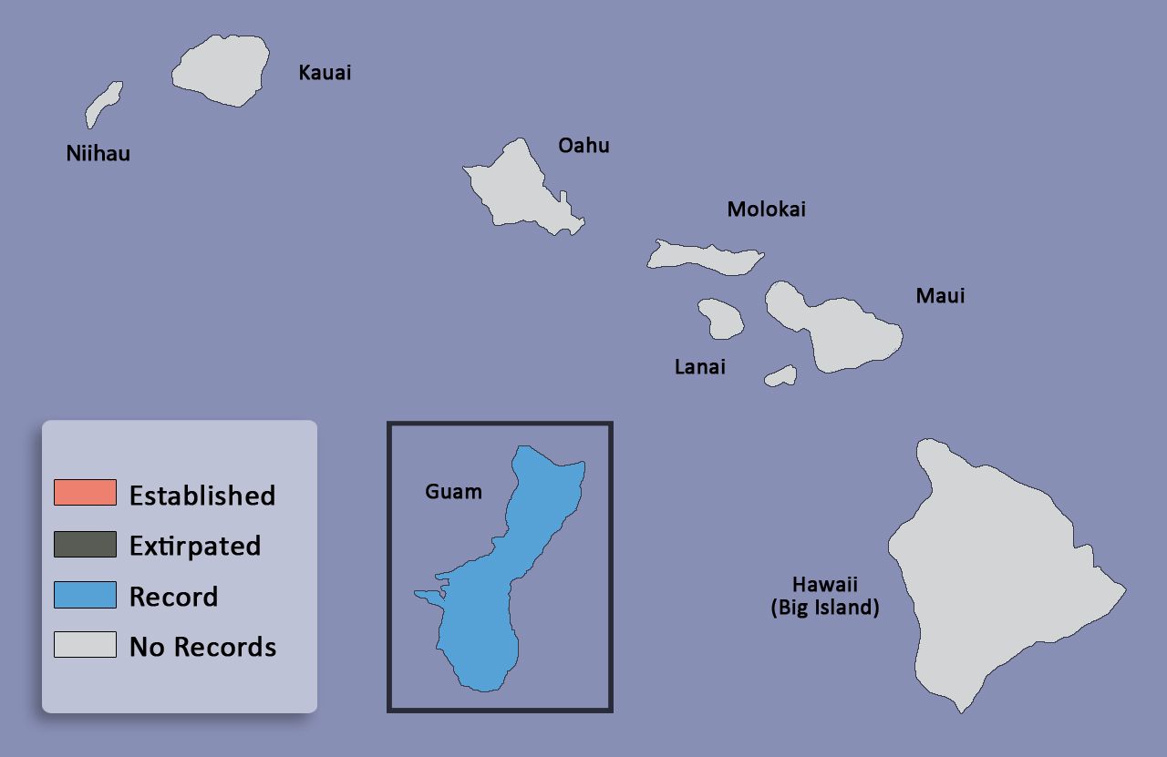 Bourquin O. 2002. Invertebrates recorded from the Northern Mariana Islands status 2002. CNMI Invertebrate Collection Crees-Northern Marianas College, Saipan. checklist. However, it appears that the species is known only from the type specimen, and no further specimens have been taken on Guam. This suggests the species is not established.