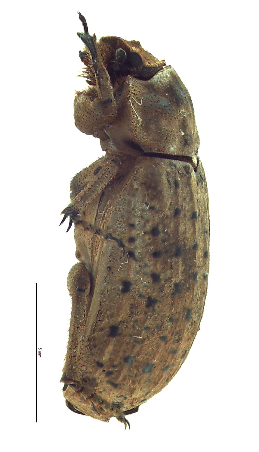 Total body length 11.1–14.1 mm (0.44–0.56 in). Body shape oval; surface rough and warty, often dirt encrusted. Venter flat, dorsum convex in lateral view. Color dark grey-brown. Pronotumpronotum: